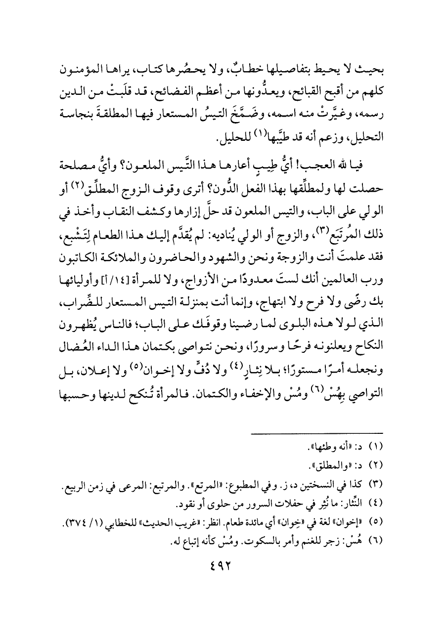 بحيث لا يحيط بتفاصيلها خطابٌ، ولا يحصُرها كتاب، يراها المؤمنون كلهم من أقبح القبائح، ويعدُّونها من أعظم الفضائح، قد قلَبتْ من الدين رسمه، وغيَّرتْ منه اسمه، وضَمَّخَ التيسُ المستعار فيها المطلقةَ بنجاسة التحليل، وزعم أنه قد طيَّبها (¬١) للحليل.