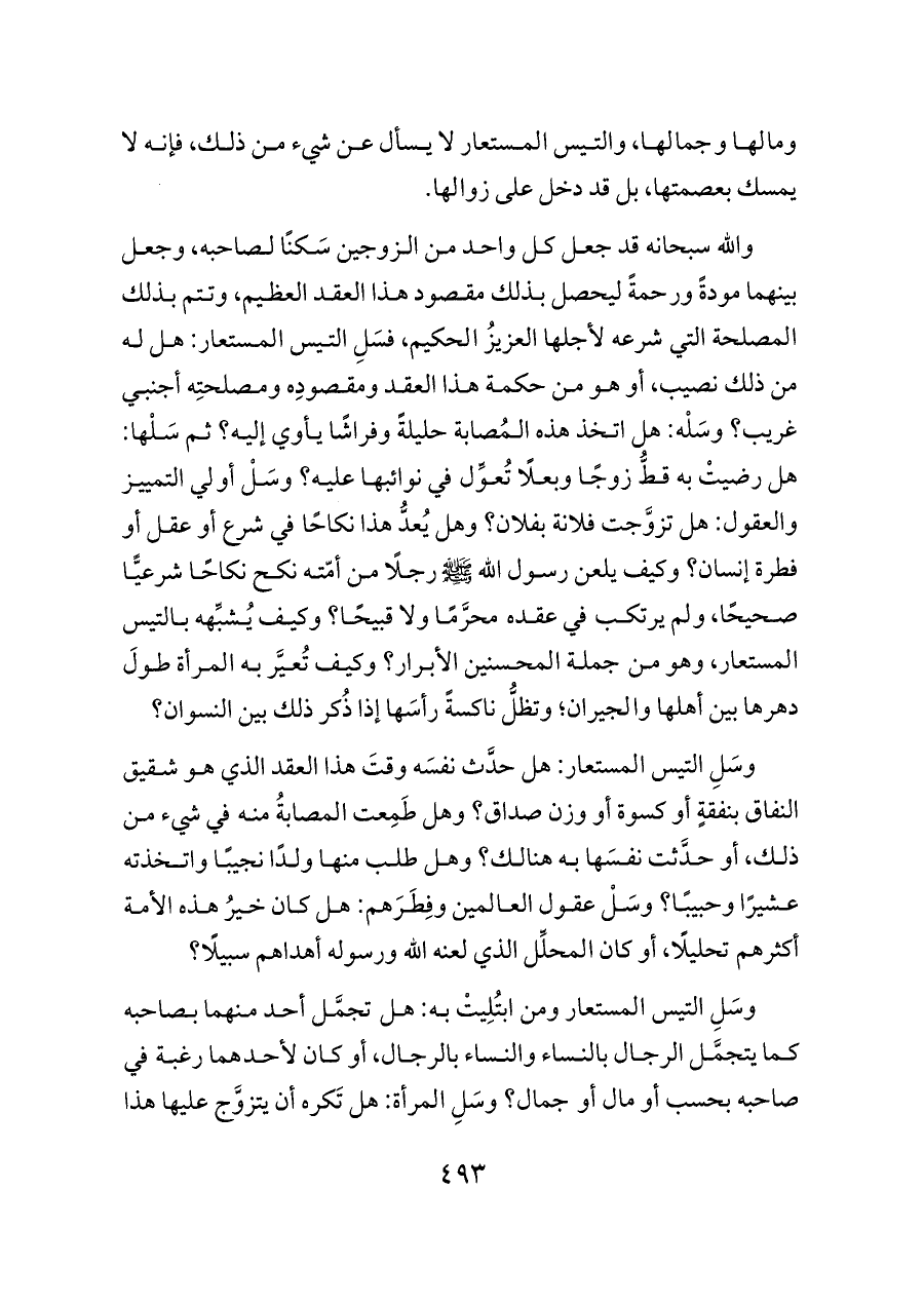 وسَلِ التيس المستعار: هل حدَّث نفسَه وقتَ هذا العقد الذي هو شقيق النفاق بنفقةٍ أو كسوة أو وزن صداق؟ وهل طَمِعت المصابةُ منه في شيء من ذلك، أو حدَّثت نفسَها به هنالك؟ وهل طلب منها ولدًا نجيبًا واتخذته عشيرًا وحبيبًا؟ وسَلْ عقول العالمين وفِطَرَهم: هل كان خيرُ هذه الأمة أكثرهم تحليلًا، أو كان المحلِّل الذي لعنه الله ورسوله أهداهم سبيلًا؟