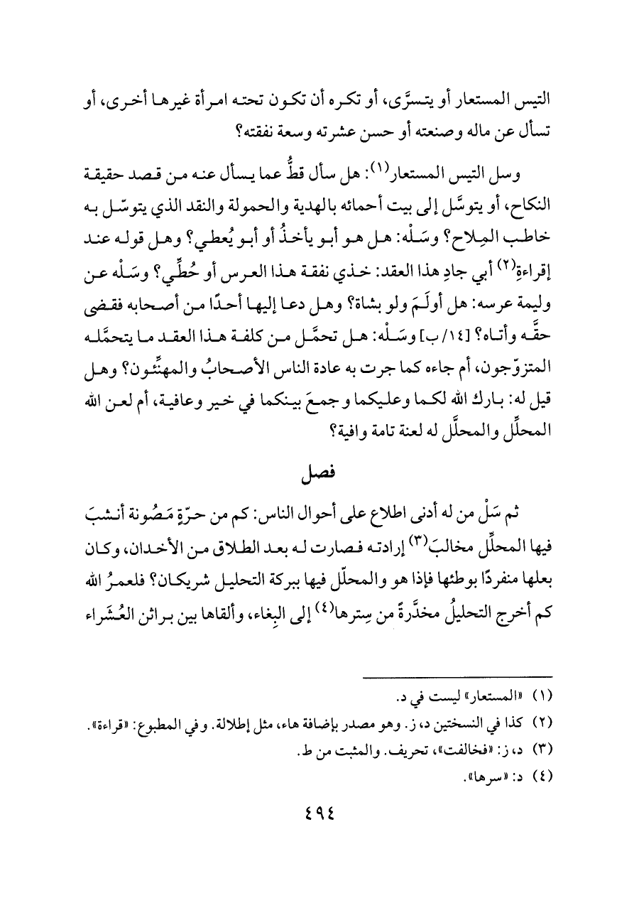 وسل التيس المستعار (¬١): هل سأل قطُّ عما يسأل عنه من قصد حقيقة النكاح، أو يتوسَّل إلى بيت أحمائه بالهدية والحمولة والنقد الذي يتوسّل به خاطب المِلاح؟ وسَلْه: هل هو أبو يأخذُ أو أبو يُعطي؟ وهل قوله عند إقراءةِ (¬٢) أبي جادِ هذا العقد: خذي نفقة هذا العرس أو حُطِّي؟ وسَلْه عن وليمة عرسه: هل أولَمَ ولو بشاة؟ وهل دعا إليها أحدًا من أصحابه فقضى حقَّه وأتاه؟ [١٤/ب] وسَلْه: هل تحمَّل من كلفة هذا العقد ما يتحمَّله المتزوّجون، أم جاءه كما جرت به عادة الناس الأصحابُ والمهنِّئون؟ وهل قيل له: بارك الله لكما وعليكما وجمعَ بينكما في خير وعافية، أم لعن الله المحلِّل والمحلَّل له لعنة تامة وافية؟