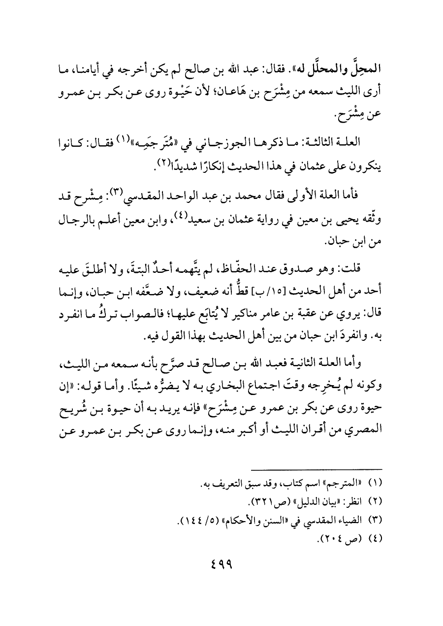 وأما العلة الثانية فعبد الله بن صالح قد صرَّح بأنه سمعه من الليث، وكونه لم يُخرِجه وقتَ اجتماع البخاري به لا يضرُّه شيئًا. وأما قوله: «إن حيوة روى عن بكر بن عمرو عن مِشْرَح» فإنه يريد به أن حيوة بن شُريح المصري من أقران الليث أو أكبر منه، وإنما روى عن بكر بن عمرو عن