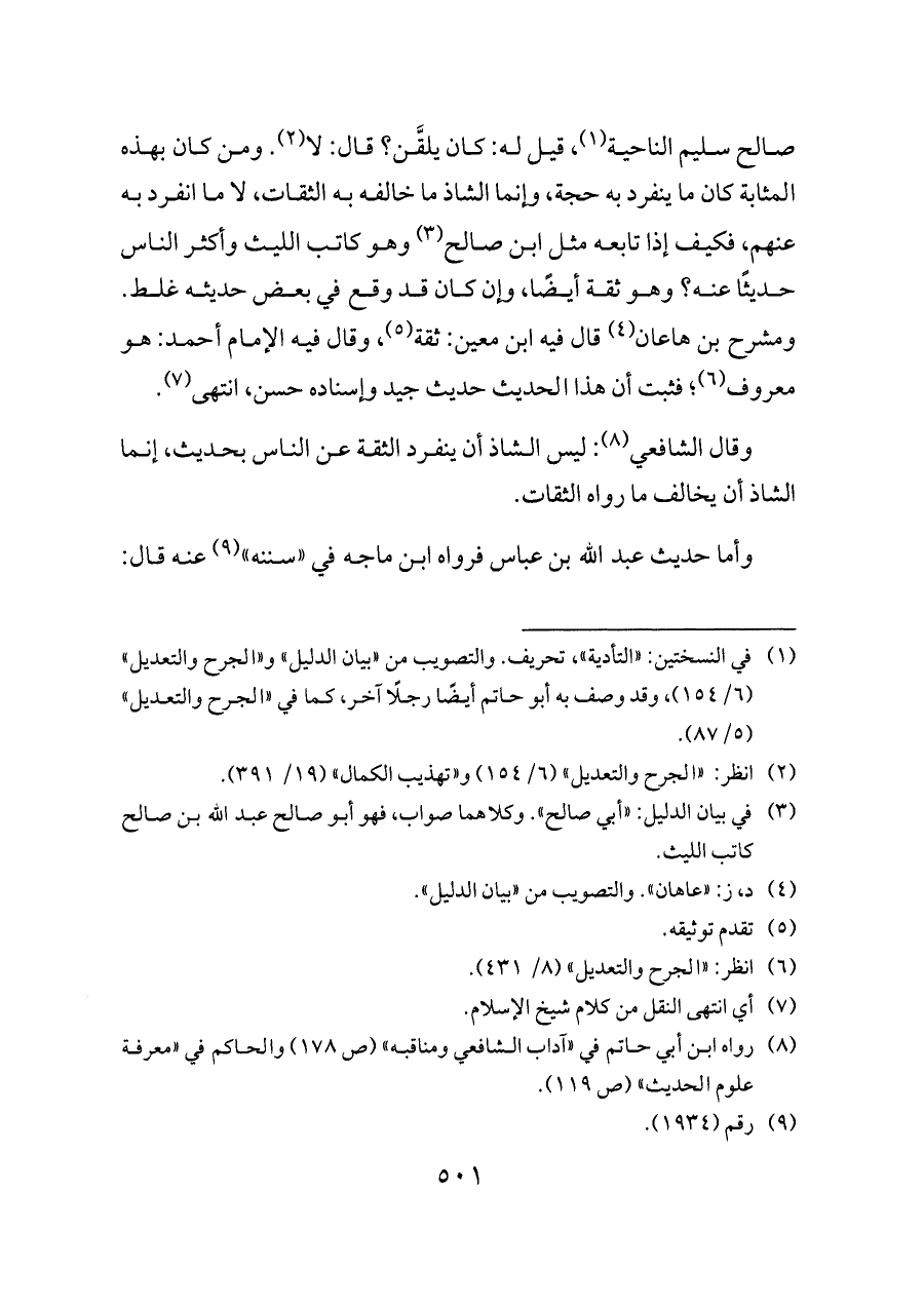صالح سليم الناحية (¬١)، قيل له: كان يلقَّن؟ قال: لا (¬٢). ومن كان بهذه المثابة كان ما ينفرد به حجة، وإنما الشاذ ما خالفه به الثقات، لا ما انفرد به عنهم، فكيف إذا تابعه مثل ابن صالح (¬٣) وهو كاتب الليث وأكثر الناس حديثًا عنه؟ وهو ثقة أيضًا، وإن كان قد وقع في بعض حديثه غلط. ومشرح بن هاعان (¬٤) قال فيه ابن معين: ثقة (¬٥)، وقال فيه الإمام أحمد: هو معروف (¬٦)؛ فثبت أن هذا الحديث حديث جيد وإسناده حسن، انتهى (¬٧).