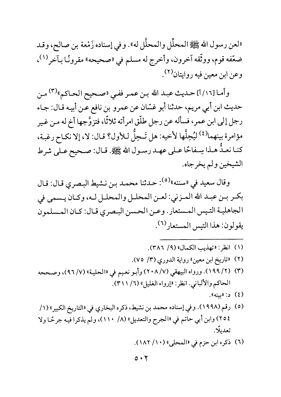 «لعن رسول الله - صلى الله عليه وسلم - المحلِّل والمحلَّل له». وفي إسناده زَمْعة بن صالح، وقد ضعّفه قوم، ووثّقه آخرون، وأخرج له مسلم في «صحيحه» مقرونًا بآخر (¬١)، وعن ابن معين فيه روايتان (¬٢).