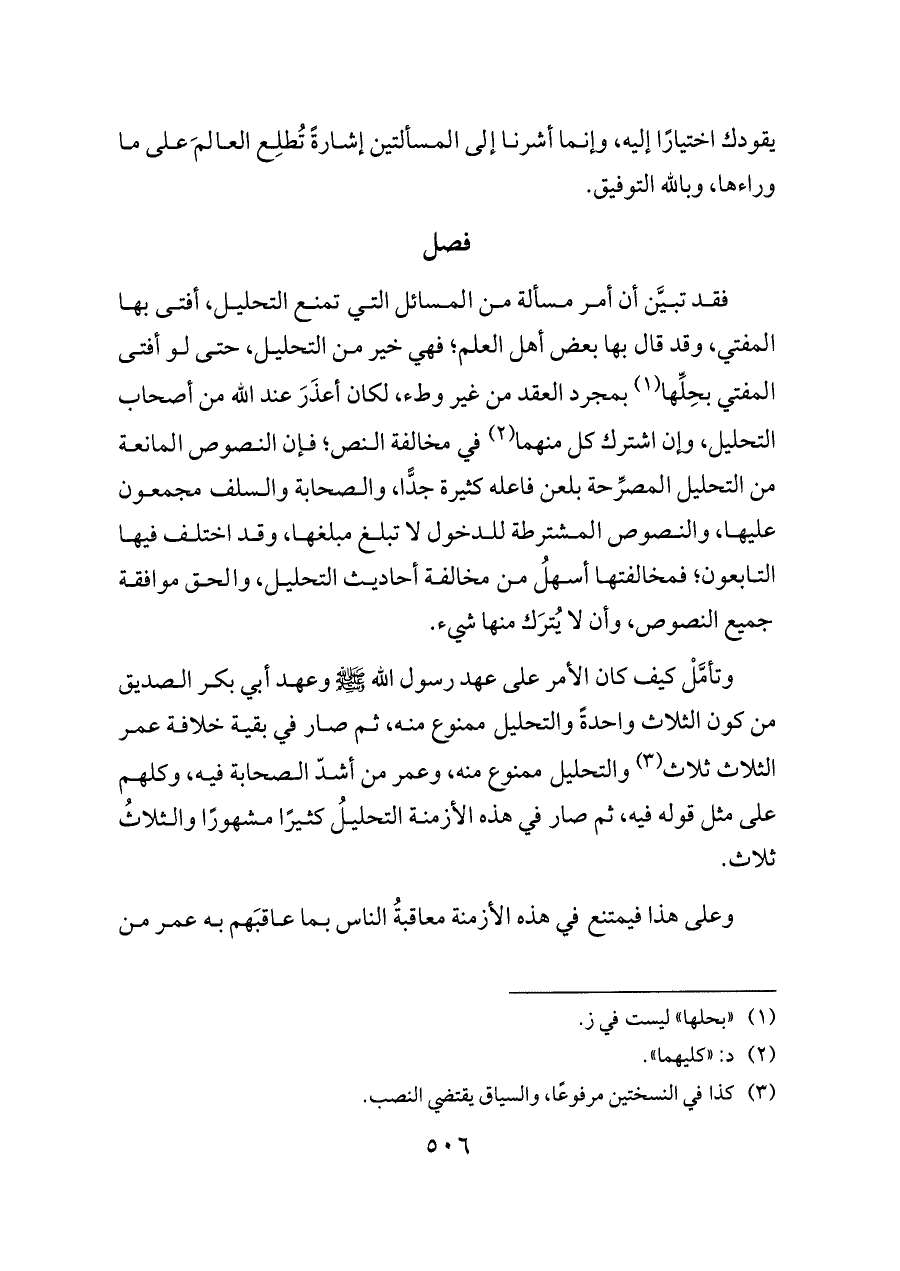 فقد تبيَّن أن أمر مسألة من المسائل التي تمنع التحليل، أفتى بها المفتي، وقد قال بها بعض أهل العلم؛ فهي خير من التحليل، حتى لو أفتى المفتي بحِلِّها (¬١) بمجرد العقد من غير وطء، لكان أعذَرَ عند الله من أصحاب التحليل، وإن اشترك كل منهما (¬٢) في مخالفة النص؛ فإن النصوص المانعة من التحليل المصرِّحة بلعن فاعله كثيرة جدًّا، والصحابة والسلف مجمعون عليها، والنصوص المشترطة للدخول لا تبلغ مبلغها، وقد اختلف فيها التابعون؛ فمخالفتها أسهلُ من مخالفة أحاديث التحليل، والحق موافقة جميع النصوص، وأن لا يُترَك منها شيء.