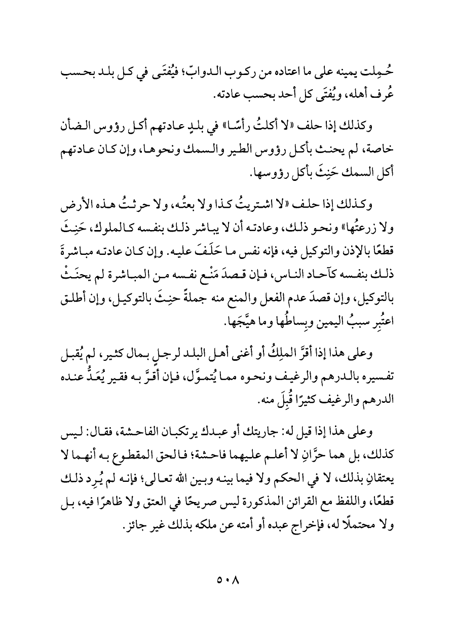 وكذلك إذا حلف «لا أكلتُ رأسًا» في بلدٍ عادتهم أكل رؤوس الضأن خاصة، لم يحنث بأكل رؤوس الطير والسمك ونحوها، وإن كان عادتهم أكل السمك حَنِثَ بأكل رؤوسها.