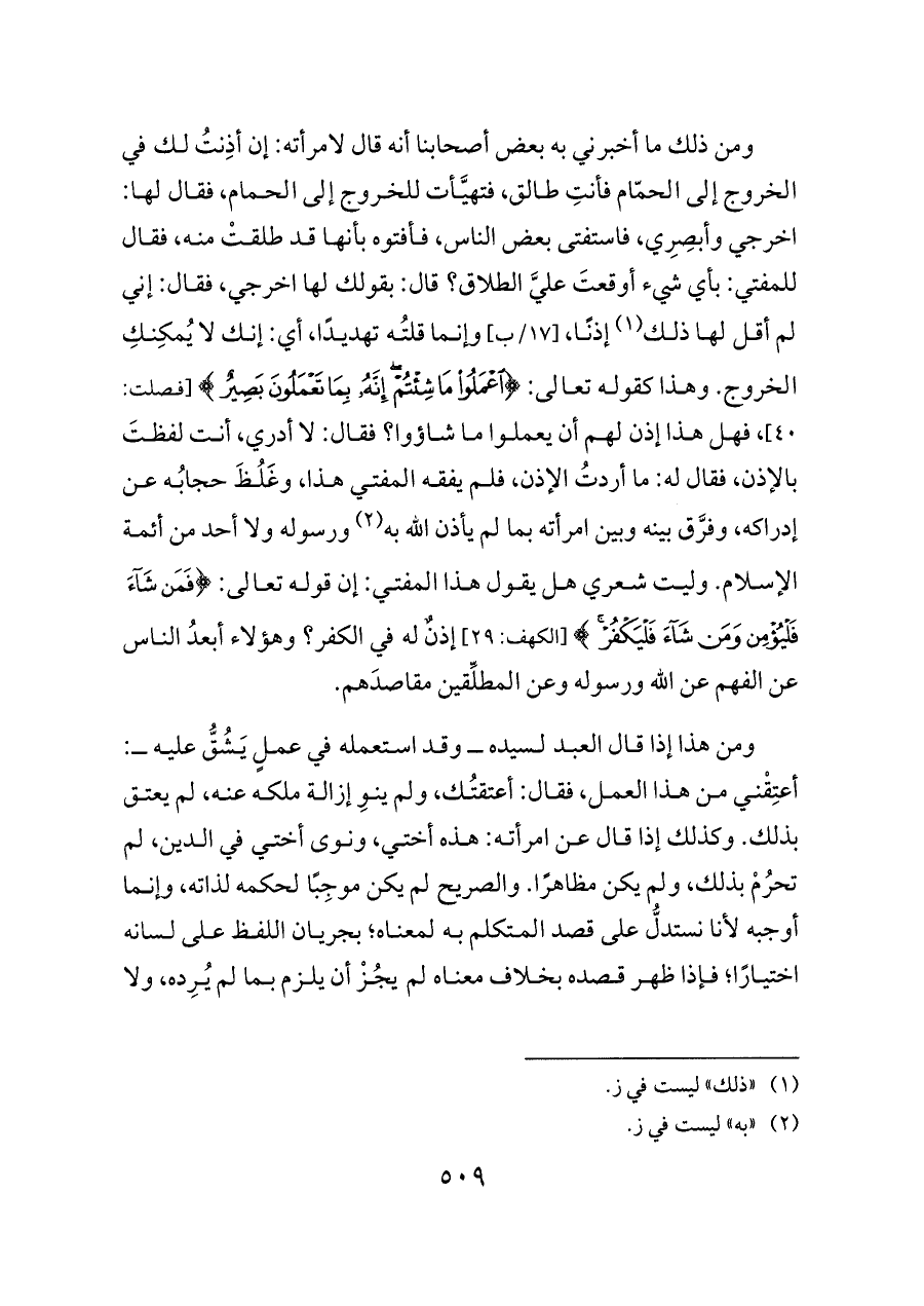 ومن ذلك ما أخبرني به بعض أصحابنا أنه قال لامرأته: إن أذِنتُ لك في الخروج إلى الحمّام فأنتِ طالق، فتهيَّأت للخروج إلى الحمام، فقال لها: اخرجي وأبصِرِي، فاستفتى بعض الناس، فأفتوه بأنها قد طلقتْ منه، فقال للمفتي: بأي شيء أوقعتَ عليَّ الطلاق؟ قال: بقولك لها اخرجي، فقال: إني لم أقل لها ذلك (¬١) إذنًا، [١٧/ب] وإنما قلتُه تهديدًا، أي: إنك لا يُمكِنكِ الخروج. وهذا كقوله تعالى: {اعْمَلُوا مَا شِئْتُمْ إِنَّهُ بِمَا تَعْمَلُونَ بَصِيرٌ} [فصلت: ٤٠]، فهل هذا إذن لهم أن يعملوا ما شاؤوا؟ فقال: لا أدري، أنت لفظتَ بالإذن، فقال له: ما أردتُ الإذن، فلم يفقه المفتي هذا، وغَلُظَ حجابُه عن إدراكه، وفرَّق بينه وبين امرأته بما لم يأذن الله به (¬٢) ورسوله ولا أحد من أئمة الإسلام. وليت شعري هل يقول هذا المفتي: إن قوله تعالى: {فَمَنْ شَاءَ فَلْيُؤْمِنْ وَمَنْ شَاءَ فَلْيَكْفُرْ} [الكهف: ٢٩] إذنٌ له في الكفر؟ وهؤلاء أبعدُ الناس عن الفهم عن الله ورسوله وعن المطلِّقين مقاصدَهم.