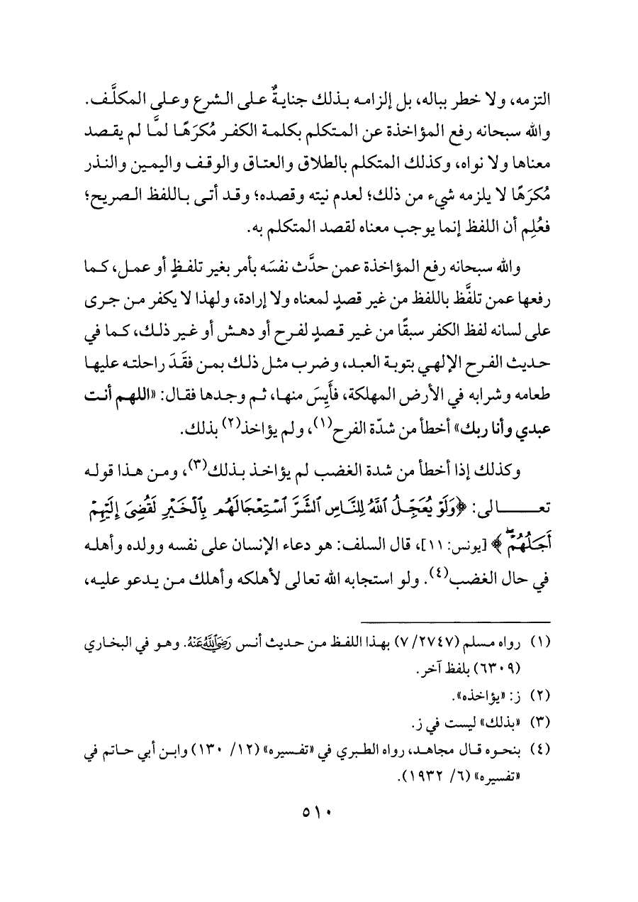 وكذلك إذا أخطأ من شدة الغضب لم يؤاخذ بذلك (¬٣)، ومن هذا قوله تعالى: {وَلَوْ يُعَجِّلُ اللَّهُ لِلنَّاسِ الشَّرَّ اسْتِعْجَالَهُمْ بِالْخَيْرِ لَقُضِيَ إِلَيْهِمْ أَجَلُهُمْ} [يونس: ١١]، قال السلف: هو دعاء الإنسان على نفسه وولده وأهله في حال الغضب (¬٤). ولو استجابه الله تعالى لأهلكه وأهلك من يدعو عليه،