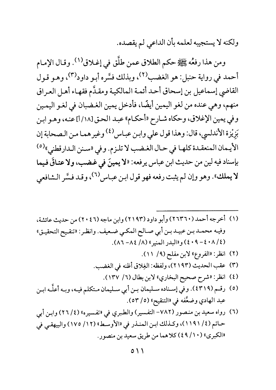 ومن هذا رفعُه - صلى الله عليه وسلم - حكم الطلاق عمن طلَّق في إغلاق (¬١). وقال الإمام أحمد في رواية حنبل: هو الغضب (¬٢)، وبذلك فسَّره أبو داود (¬٣)، وهو قول القاضي إسماعيل بن إسحاق أحد أئمة المالكية ومقدَّم فقهاء أهل العراق منهم، وهي عنده من لغو اليمين أيضًا، فأدخل يمين الغضبان في لغو اليمين وفي يمين الإغلاق، وحكاه شارح «أحكام» عبد الحق [١٨/أ] عنه، وهو ابن بَزِيْزة الأندلسي، قال: وهذا قول علي وابن عباس (¬٤) وغيرهما من الصحابة إن الأيمان المنعقدة كلها في حال الغضب لا تلزم. وفي «سنن الدارقطني» (¬٥) بإسناد فيه لين من حديث ابن عباس يرفعه: «لا يمينَ في غضب، ولا عتاقَ فيما لا يملك». وهو وإن لم يثبت رفعه فهو قول ابن عباس (¬٦)، وقد فسَّر الشافعي