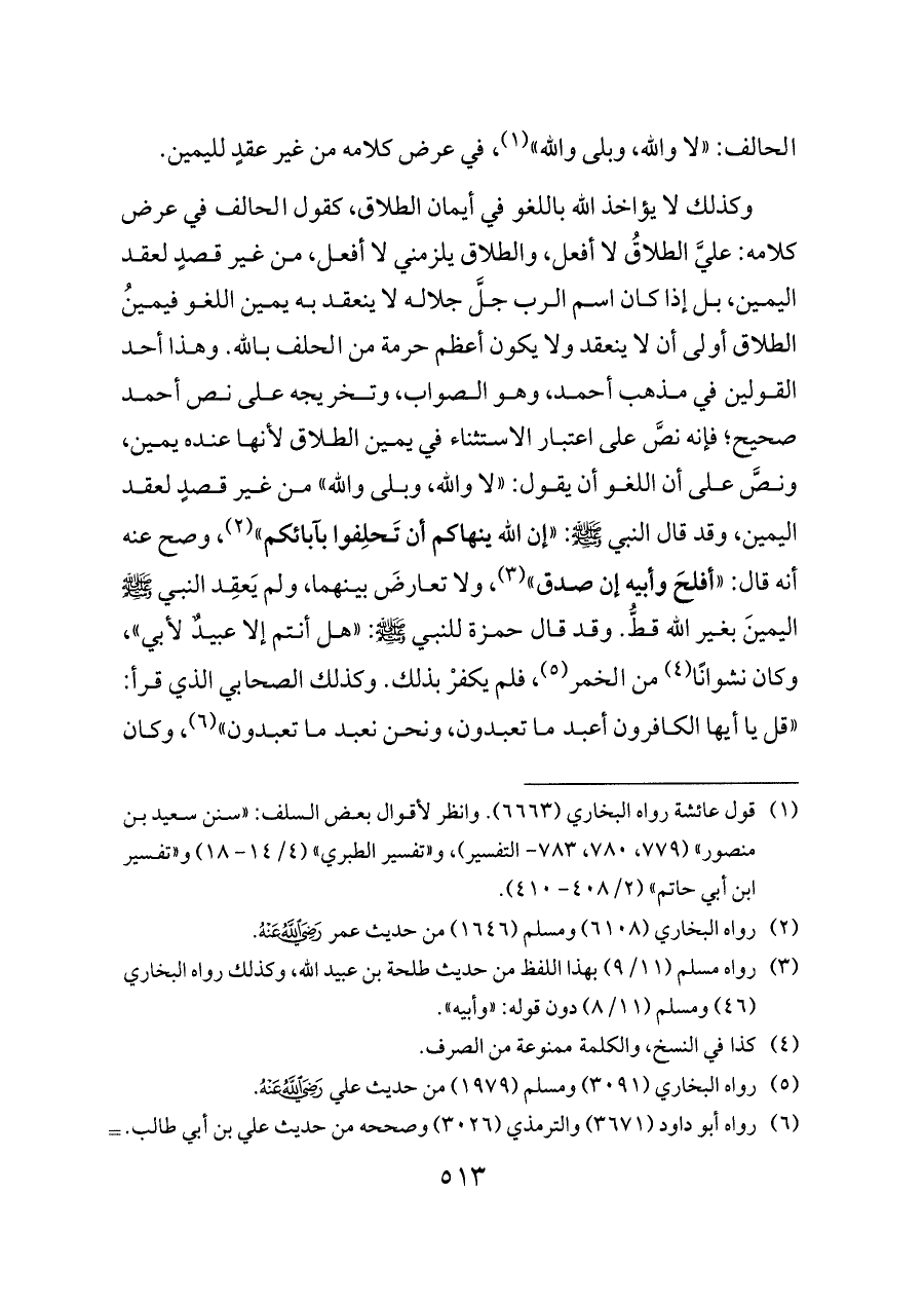 وكذلك لا يؤاخذ الله باللغو في أيمان الطلاق، كقول الحالف في عرض كلامه: عليَّ الطلاقُ لا أفعل، والطلاق يلزمني لا أفعل، من غير قصدٍ لعقد اليمين، بل إذا كان اسم الرب جلَّ جلاله لا ينعقد به يمين اللغو فيمينُ الطلاق أولى أن لا ينعقد ولا يكون أعظم حرمة من الحلف بالله. وهذا أحد القولين في مذهب أحمد، وهو الصواب، وتخريجه على نص أحمد صحيح؛ فإنه نصَّ على اعتبار الاستثناء في يمين الطلاق لأنها عنده يمين، ونصَّ على أن اللغو أن يقول: «لا والله, وبلى والله» من غير قصدٍ لعقد اليمين، وقد قال النبي - صلى الله عليه وسلم -: «إن الله ينهاكم أن تَحلِفوا بآبائكم» (¬٢)، وصح عنه أنه قال: «أفلحَ وأبيه إن صدق» (¬٣)، ولا تعارضَ بينهما، ولم يَعقِد النبي - صلى الله عليه وسلم - اليمينَ بغير الله قطُّ. وقد قال حمزة للنبي - صلى الله عليه وسلم -: «هل أنتم إلا عبيدٌ لأبي»، وكان نشوانًا (¬٤) من الخمر (¬٥)، فلم يكفرْ بذلك. وكذلك الصحابي الذي قرأ: «قل يا أيها الكافرون أعبد ما تعبدون، ونحن نعبد ما تعبدون» (¬٦)، وكان