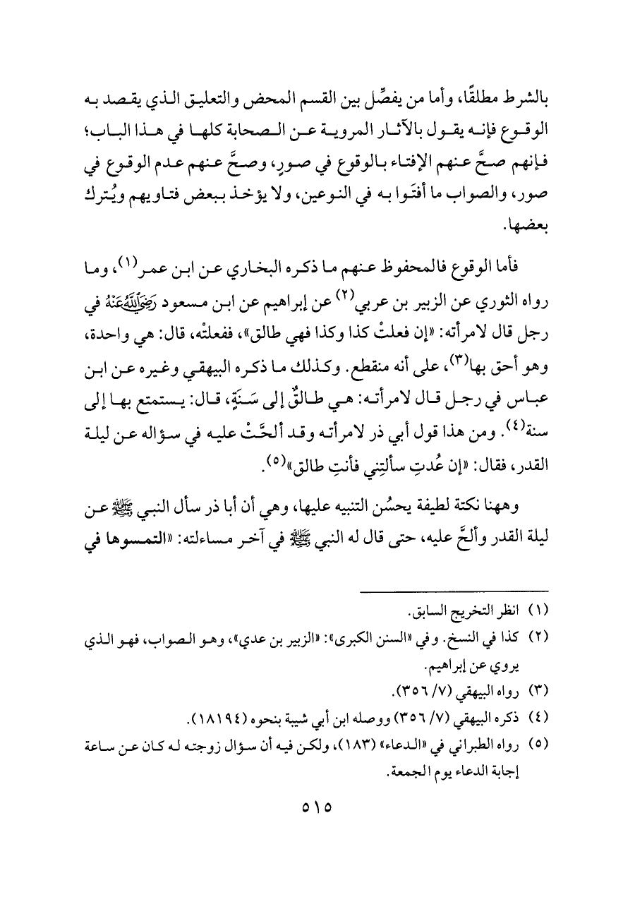 فأما الوقوع فالمحفوظ عنهم ما ذكره البخاري عن ابن عمر (¬١)، وما رواه الثوري عن الزبير بن عربي (¬٢) عن إبراهيم عن ابن مسعود - رضي الله عنه - في رجل قال لامرأته: «إن فعلتْ كذا وكذا فهي طالق»، ففعلتْه، قال: هي واحدة، وهو أحق بها (¬٣)، على أنه منقطع. وكذلك ما ذكره البيهقي وغيره عن ابن عباس في رجل قال لامرأته: هي طالقٌ إلى سَنَةٍ، قال: يستمتع بها إلى سنة (¬٤). ومن هذا قول أبي ذر لامرأته وقد ألحَّتْ عليه في سؤاله عن ليلة القدر، فقال: «إن عُدتِ سألتِني فأنتِ طالق» (¬٥).