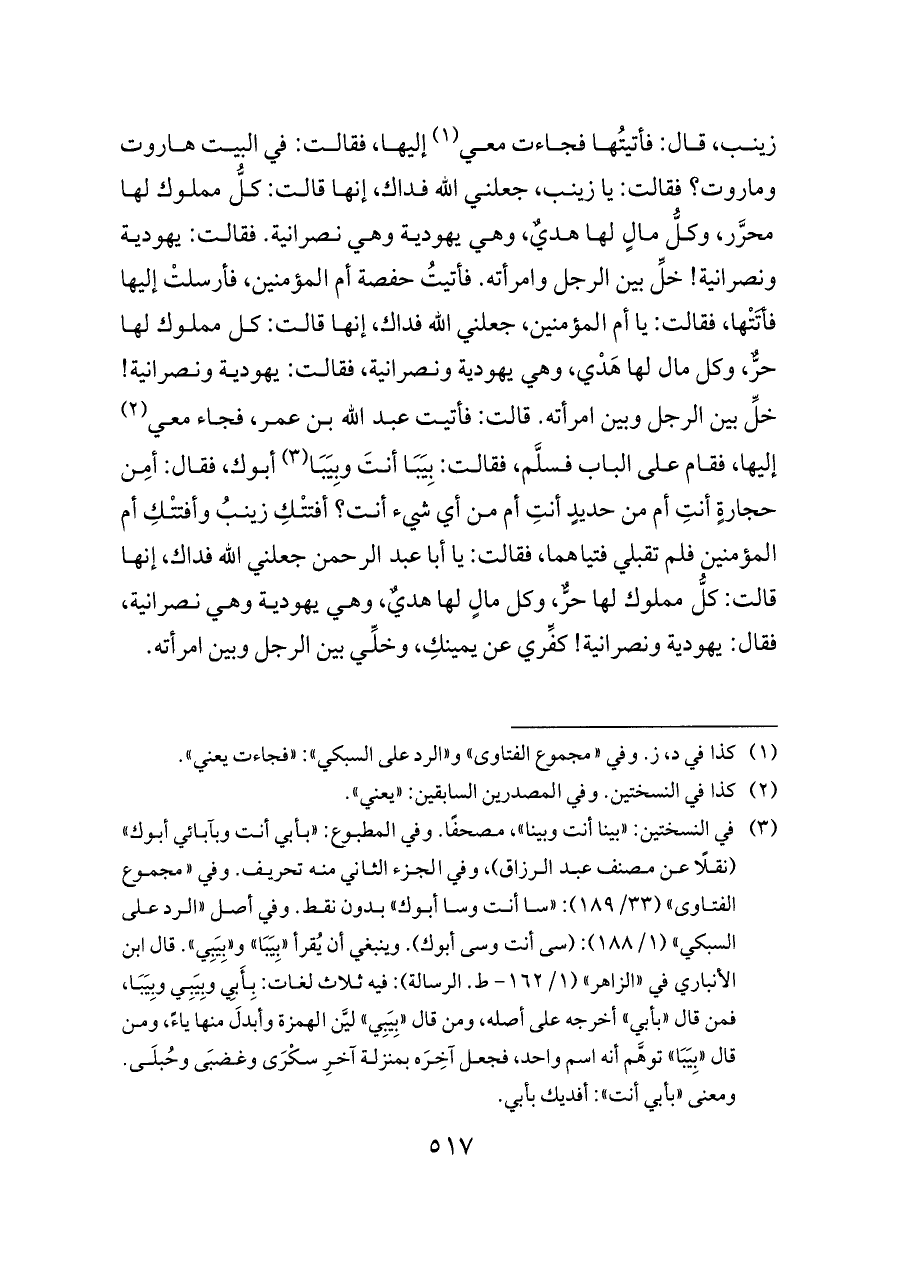 زينب، قال: فأتيتُها فجاءت معي (¬١) إليها، فقالت: في البيت هاروت وماروت؟ فقالت: يا زينب، جعلني الله فداك، إنها قالت: كلُّ مملوك لها محرَّر، وكلُّ مالٍ لها هديٌ، وهي يهودية وهي نصرانية. فقالت: يهودية ونصرانية! خلِّ بين الرجل وامرأته. فأتيتُ حفصة أم المؤمنين، فأرسلتْ إليها فأتَتْها، فقالت: يا أم المؤمنين، جعلني الله فداك، إنها قالت: كل مملوك لها حرٌّ، وكل مال لها هَدْي، وهي يهودية ونصرانية، فقالت: يهودية ونصرانية! خلِّ بين الرجل وبين امرأته. قالت: فأتيت عبد الله بن عمر، فجاء معي (¬٢) إليها، فقام على الباب فسلَّم، فقالت: بِيَبَا أنتَ وبِيَبَا (¬٣)