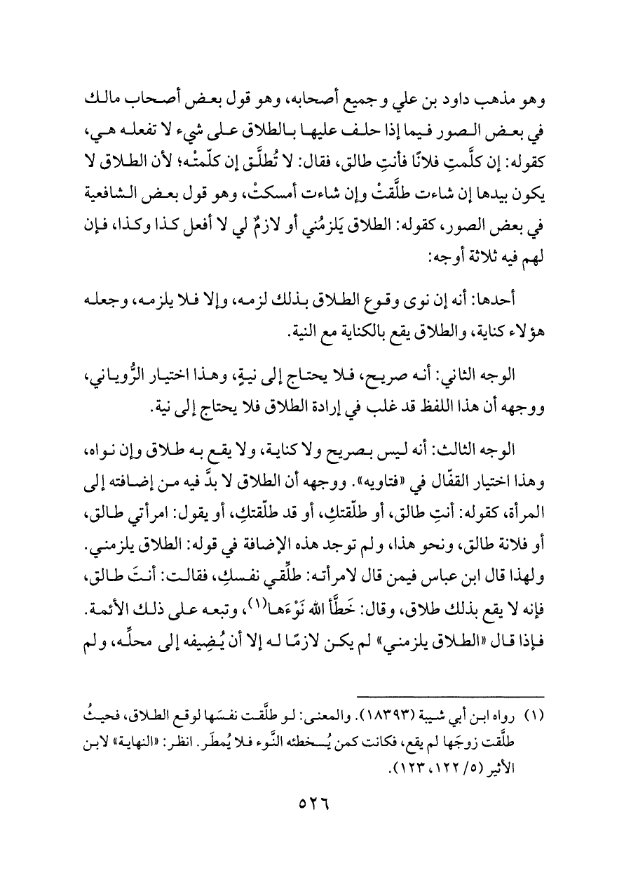 الوجه الثالث: أنه ليس بصريح ولا كناية، ولا يقع به طلاق وإن نواه، وهذا اختيار القفّال في «فتاويه». ووجهه أن الطلاق لا بدَّ فيه من إضافته إلى المرأة، كقوله: أنتِ طالق، أو طلّقتكِ، أو قد طلّقتكِ، أو يقول: امرأتي طالق، أو فلانة طالق، ونحو هذا، ولم توجد هذه الإضافة في قوله: الطلاق يلزمني. ولهذا قال ابن عباس فيمن قال لامرأته: طلِّقي نفسكِ، فقالت: أنتَ طالق، فإنه لا يقع بذلك طلاق، وقال: خَطَّأ الله نَوْءَها (¬١)، وتبعه على ذلك الأئمة. فإذا قال «الطلاق يلزمني» لم يكن لازمًا له إلا أن يُضِيفه إلى محلِّه، ولم