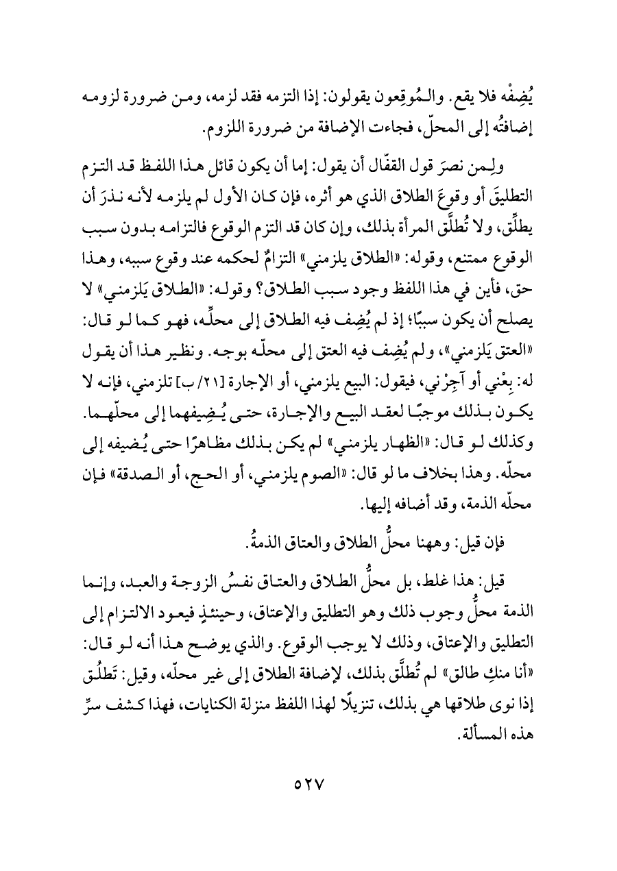 قيل: هذا غلط، بل محلُّ الطلاق والعتاق نفسُ الزوجة والعبد، وإنما الذمة محلُّ وجوب ذلك وهو التطليق والإعتاق، وحينئذٍ فيعود الالتزام إلى التطليق والإعتاق، وذلك لا يوجب الوقوع. والذي يوضح هذا أنه لو قال: «أنا منكِ طالق» لم تُطلَّق بذلك، لإضافة الطلاق إلى غير محلّه، وقيل: تَطلُق إذا نوى طلاقها هي بذلك، تنزيلًا لهذا اللفظ منزلة الكنايات، فهذا كشف سرِّ هذه المسألة.
