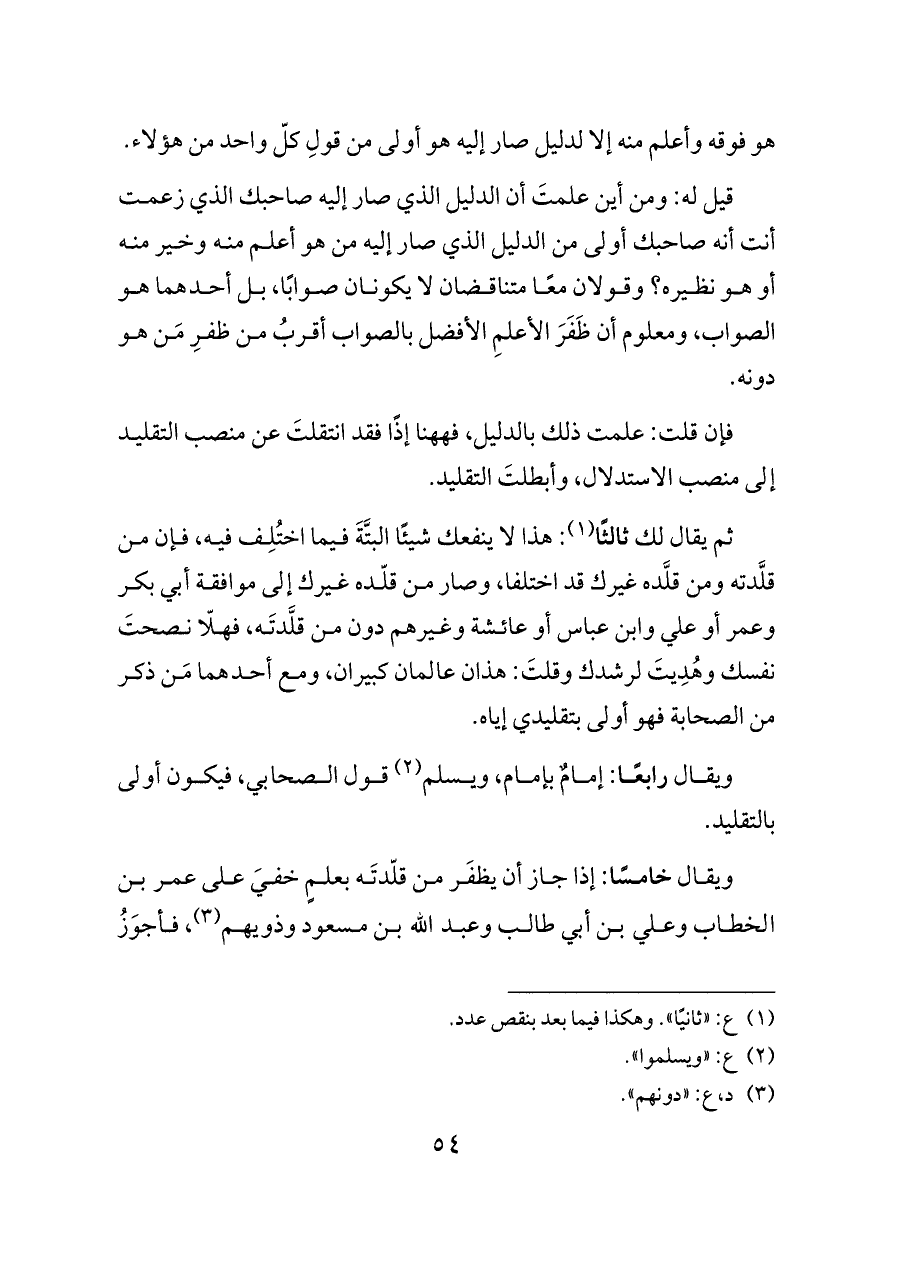 ثم يقال لك ثالثًا (¬١): هذا لا ينفعك شيئًا البتَّةَ فيما اختُلِف فيه، فإن من قلَّدته ومن قلَّده غيرك قد اختلفا، وصار من قلّده غيرك إلى موافقة أبي بكر وعمر أو علي وابن عباس أو عائشة وغيرهم دون من قلَّدتَه، فهلّا نصحتَ نفسك وهُدِيتَ لرشدك وقلتَ: هذان عالمان كبيران، ومع أحدهما مَن ذكر من الصحابة فهو أولى بتقليدي إياه.