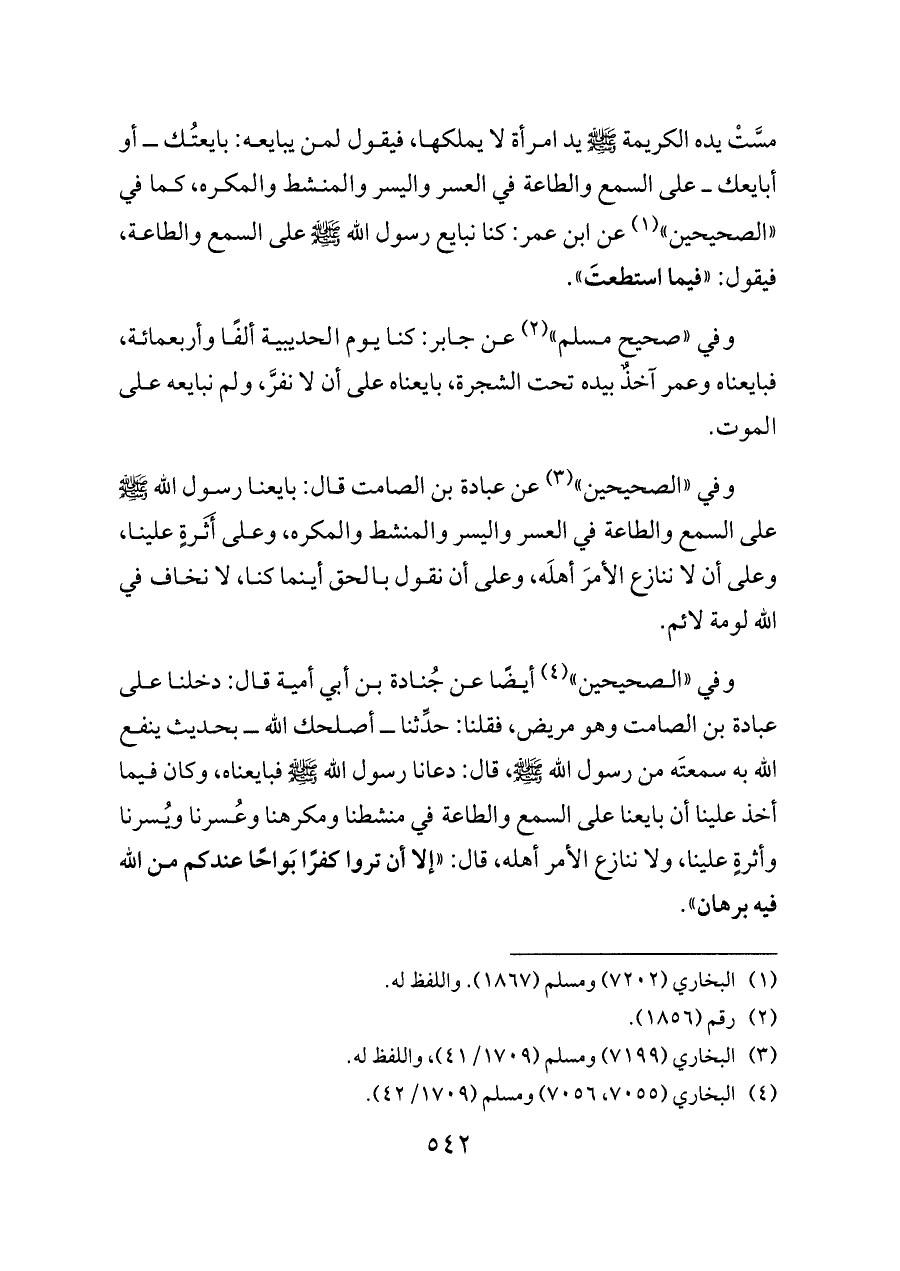وفي «الصحيحين» (¬٤) أيضًا عن جُنادة بن أبي أمية قال: دخلنا على عبادة بن الصامت وهو مريض، فقلنا: حدِّثنا ــ أصلحك الله ــ بحديث ينفع الله به سمعتَه من رسول الله - صلى الله عليه وسلم -، قال: دعانا رسول الله - صلى الله عليه وسلم - فبايعناه، وكان فيما أخذ علينا أن بايعنا على السمع والطاعة في منشطنا ومكرهنا وعُسرنا ويُسرنا وأثرةٍ علينا، ولا ننازع الأمر أهله، قال: «إلا أن تروا كفرًا بَواحًا عندكم من الله فيه برهان».