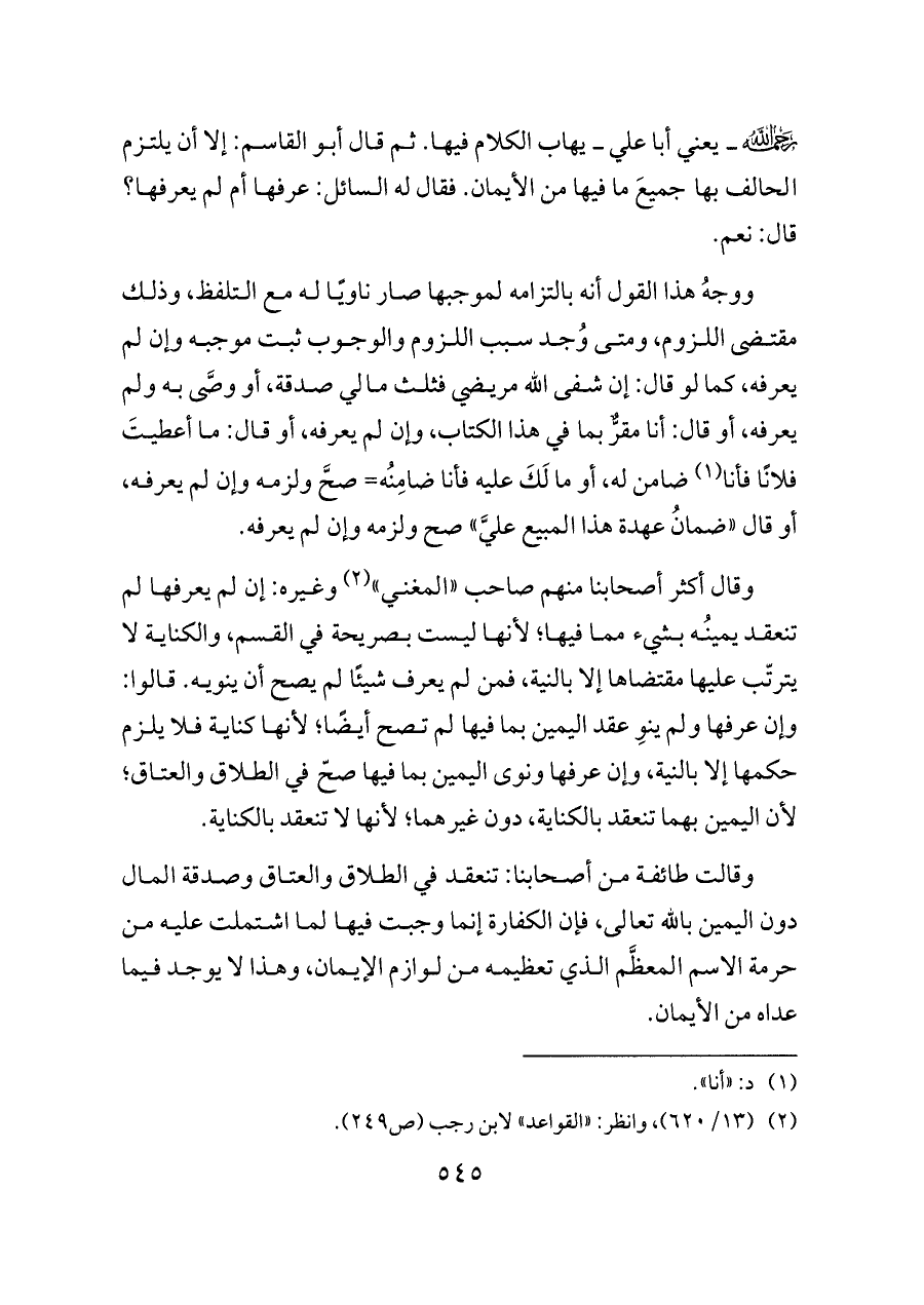 - رحمه الله - ــ يعني أبا علي ــ يهاب الكلام فيها. ثم قال أبو القاسم: إلا أن يلتزم الحالف بها جميعَ ما فيها من الأيمان. فقال له السائل: عرفها أم لم يعرفها؟ قال: نعم.
