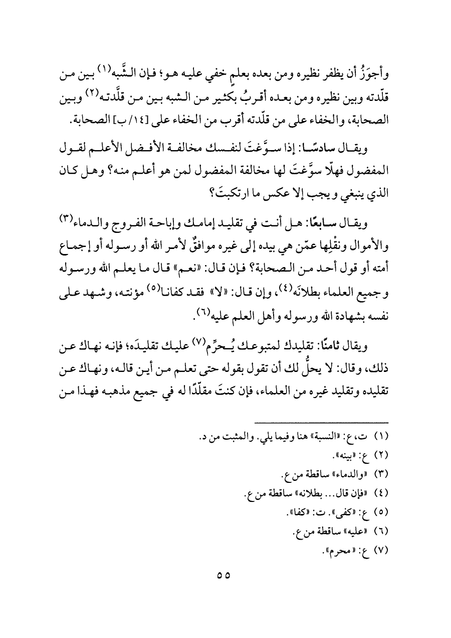 ويقال سادسًا: إذا سوَّغتَ لنفسك مخالفة الأفضل الأعلم لقول المفضول فهلّا سوَّغتَ لها مخالفة المفضول لمن هو أعلم منه؟ وهل كان الذي ينبغي ويجب إلا عكس ما ارتكبتَ؟