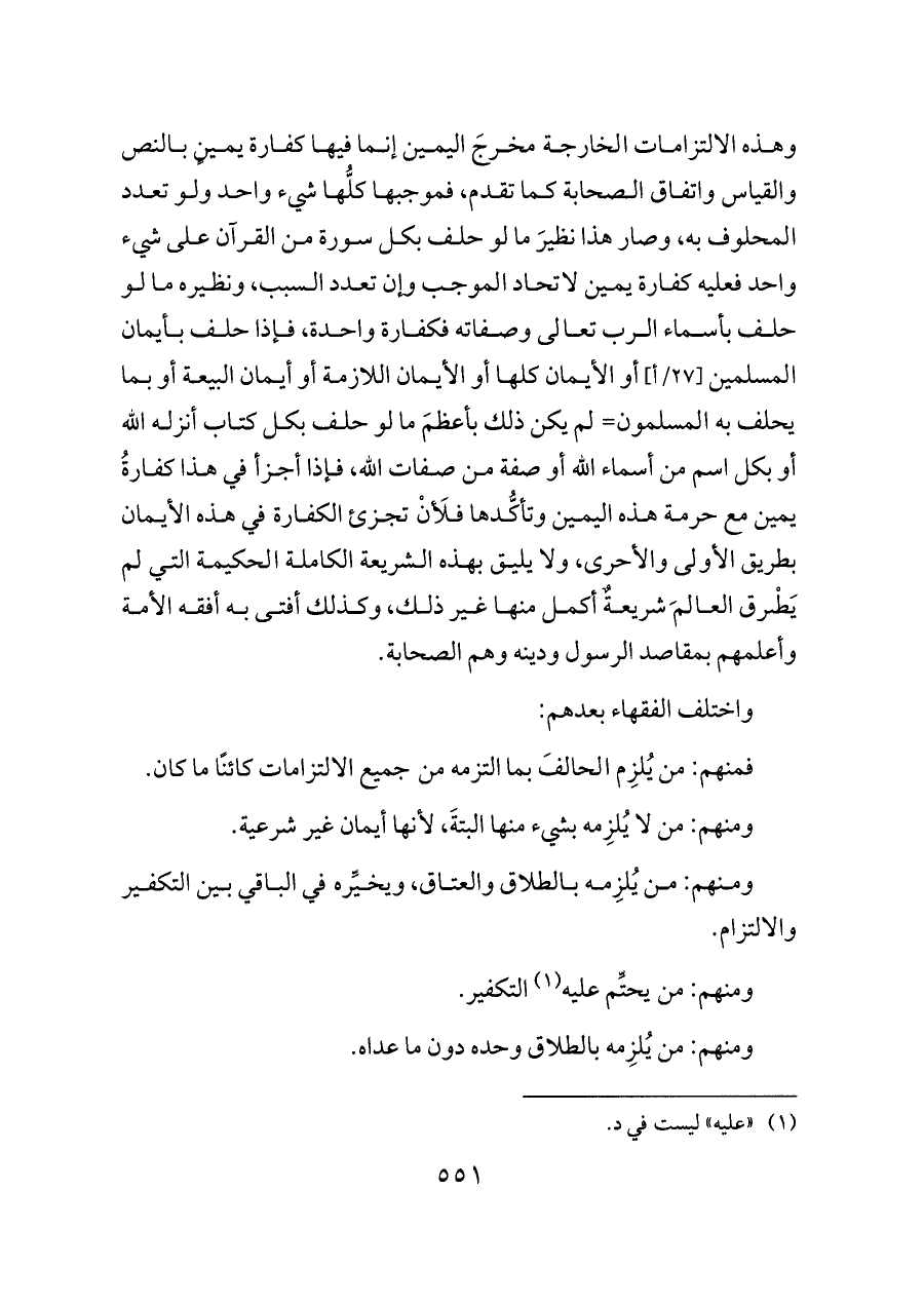 وهذه الالتزامات الخارجة مخرجَ اليمين إنما فيها كفارة يمينٍ بالنص والقياس واتفاق الصحابة كما تقدم، فموجبها كلُّها شيء واحد ولو تعدد المحلوف به، وصار هذا نظيرَ ما لو حلف بكل سورة من القرآن على شيء واحد فعليه كفارة يمين لاتحاد الموجب وإن تعدد السبب، ونظيره ما لو حلف بأسماء الرب تعالى وصفاته فكفارة واحدة، فإذا حلف بأيمان المسلمين [٢٧/أ] أو الأيمان كلها أو الأيمان اللازمة أو أيمان البيعة أو بما يحلف به المسلمون= لم يكن ذلك بأعظمَ ما لو حلف بكل كتاب أنزله الله أو بكل اسم من أسماء الله أو صفة من صفات الله، فإذا أجزأ في هذا كفارةُ يمين مع حرمة هذه اليمين وتأكُّدها فلَأنْ تجزئ الكفارة في هذه الأيمان بطريق الأولى والأحرى، ولا يليق بهذه الشريعة الكاملة الحكيمة التي لم يَطْرق العالمَ شريعةٌ أكمل منها غير ذلك، وكذلك أفتى به أفقه الأمة وأعلمهم بمقاصد الرسول ودينه وهم الصحابة.