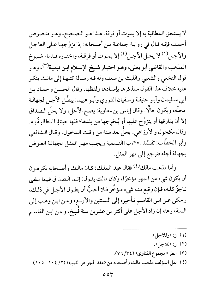 (¬٤) نقل المؤلف مذهب مالك وأصحابه من «عقد الجواهر الثمينة» (٢/ ١٠٤ - ١٠٥).