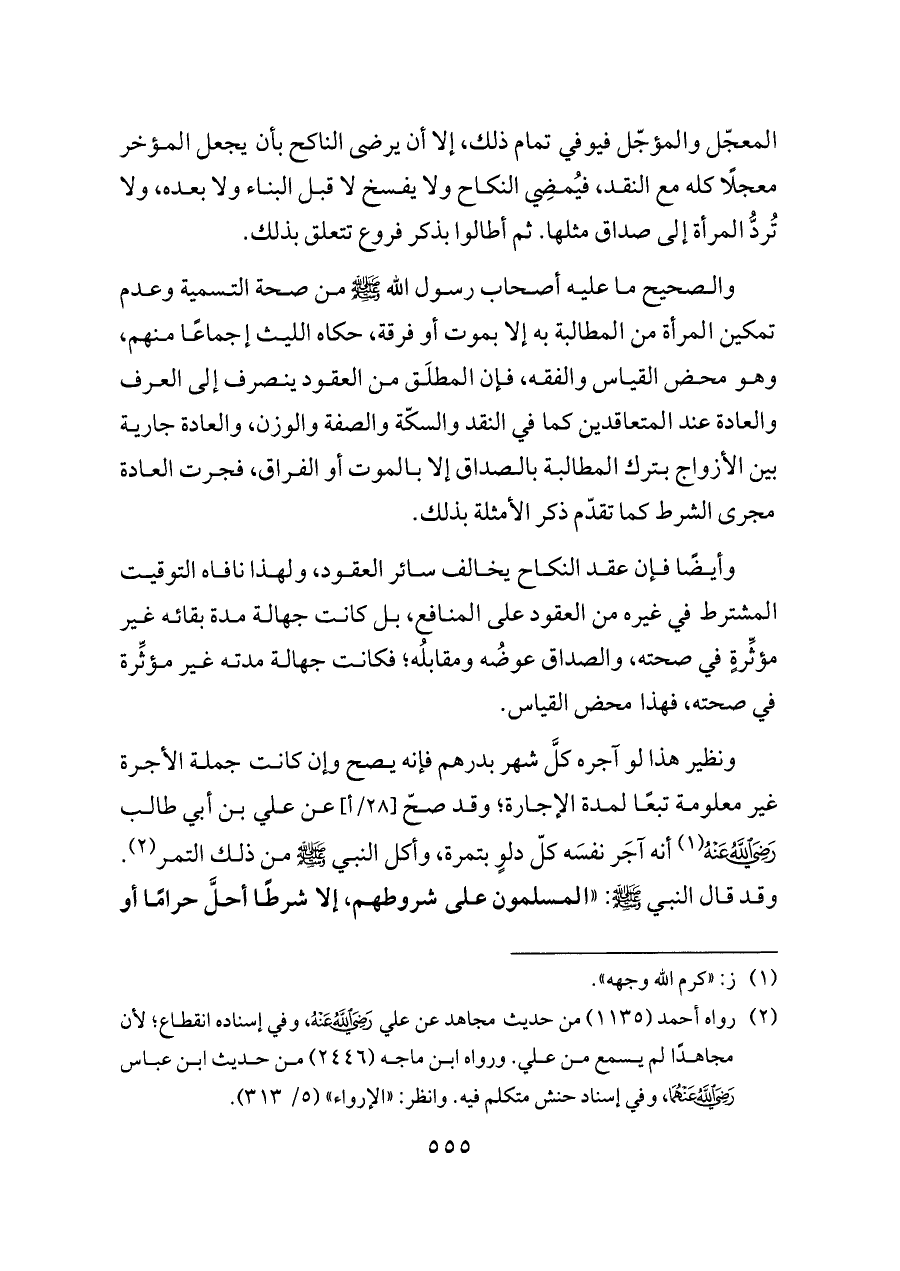 والصحيح ما عليه أصحاب رسول الله - صلى الله عليه وسلم - من صحة التسمية وعدم تمكين المرأة من المطالبة به إلا بموت أو فرقة، حكاه الليث إجماعًا منهم، وهو محض القياس والفقه، فإن المطلَق من العقود ينصرف إلى العرف والعادة عند المتعاقدين كما في النقد والسكّة والصفة والوزن، والعادة جارية بين الأزواج بترك المطالبة بالصداق إلا بالموت أو الفراق، فجرت العادة مجرى الشرط كما تقدّم ذكر الأمثلة بذلك.