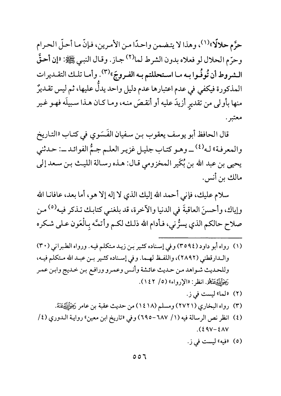 قال الحافظ أبو يوسف يعقوب بن سفيان الفَسَوي في كتاب «التاريخ والمعرفة» له (¬٤) ــ وهو كتاب جليل غزير العلم جمُّ الفوائد ــ: حدثني يحيى بن عبد الله بن بُكَير المخزومي قال: هذه رسالة الليث بن سعد إلى مالك بن أنس.