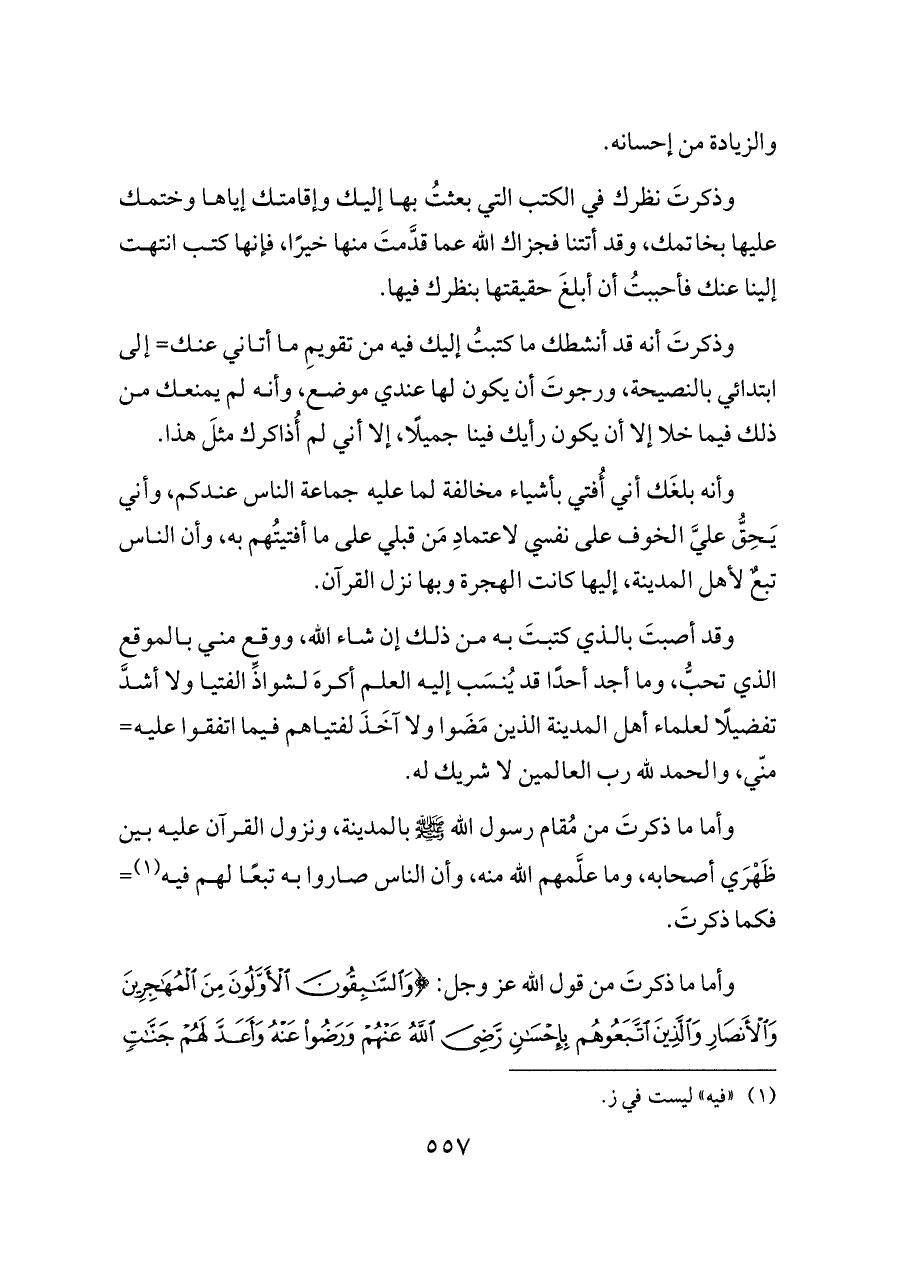 وقد أصبتَ بالذي كتبتَ به من ذلك إن شاء الله، ووقع مني بالموقع الذي تحبُّ، وما أجد أحدًا قد يُنسَب إليه العلم أكرهَ لشواذِّ الفتيا ولا أشدَّ تفضيلًا لعلماء أهل المدينة الذين مَضَوا ولا آخَذَ لفتياهم فيما اتفقوا عليه= منّي، والحمد لله رب العالمين لا شريك له.