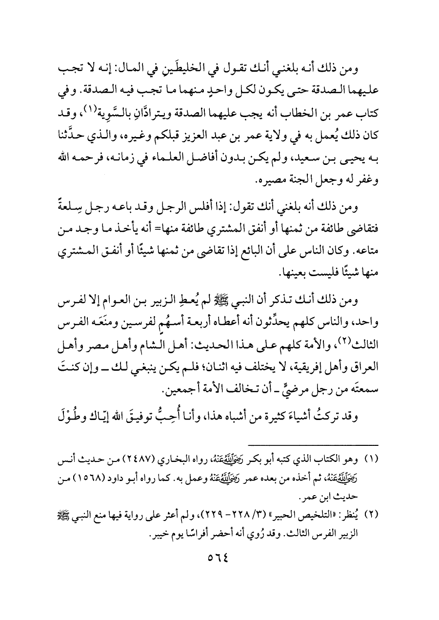 ومن ذلك أنك تذكر أن النبي - صلى الله عليه وسلم - لم يُعطِ الزبير بن العوام إلا لفرس واحد، والناس كلهم يحدِّثون أنه أعطاه أربعة أسهُمٍ لفرسين ومنَعَه الفرس الثالث (¬٢)، والأمة كلهم على هذا الحديث: أهل الشام وأهل مصر وأهل العراق وأهل إفريقية، لا يختلف فيه اثنان؛ فلم يكن ينبغي لك ــ وإن كنتَ سمعتَه من رجل مرضيٍّ ــ أن تخالف الأمة أجمعين.
