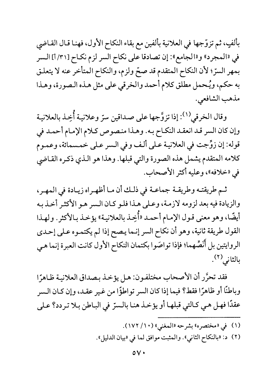 وقال الخرقي (¬١): إذا تزوَّجها على صداقين سرّ وعلانية أُخِذ بالعلانية وإن كان السر قد انعقد النكاح به. وهذا منصوص كلام الإمام أحمد في قوله: إن زوِّجت في العلانية على ألف وفي السر على خمسمائة، وعموم كلامه المتقدم يشمل هذه الصورة والتي قبلها. وهذا هو الذي ذكره القاضي في «خلافه»، وعليه أكثر الأصحاب.