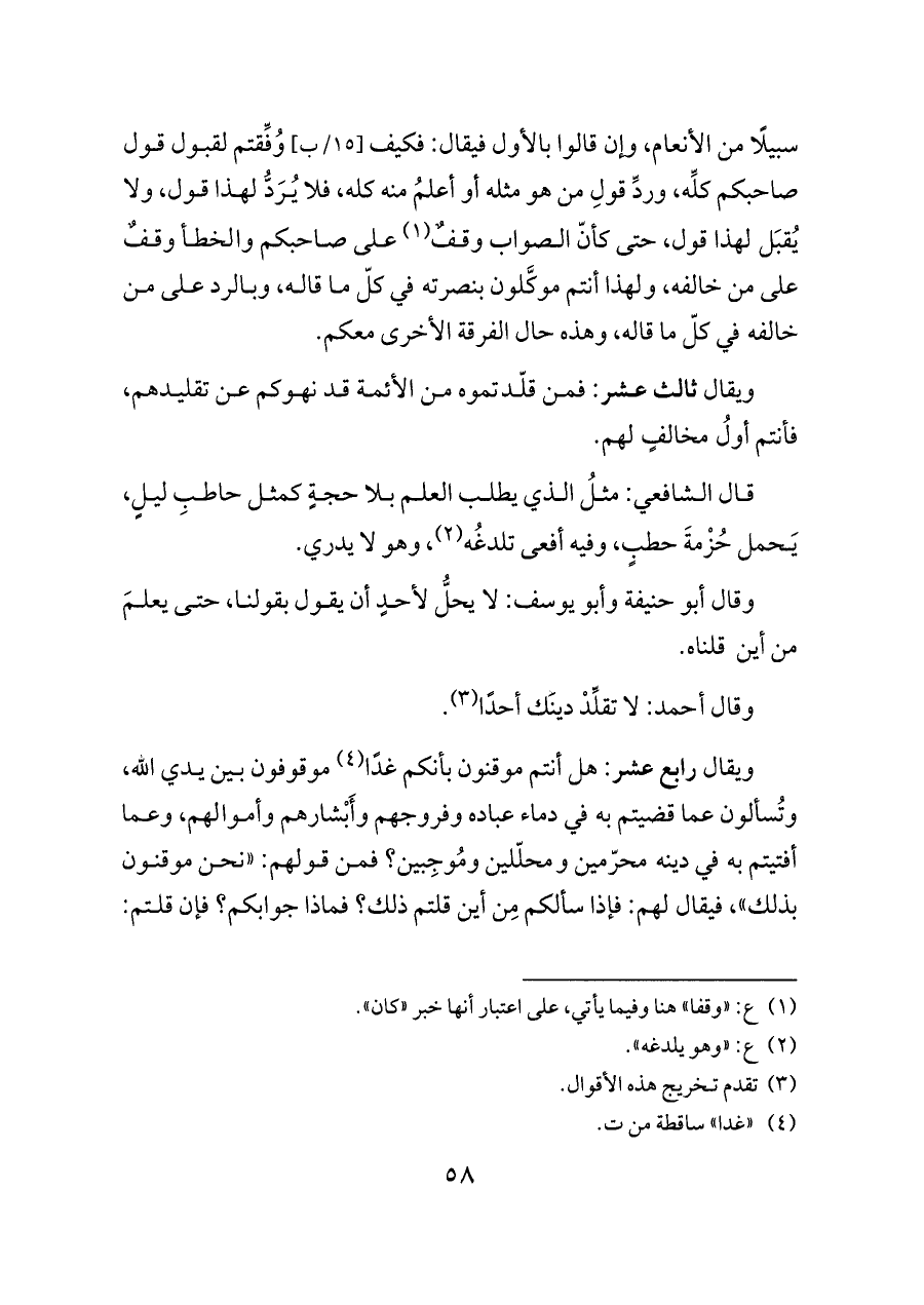 ويقال ثالث عشر: فمن قلّدتموه من الأئمة قد نهوكم عن تقليدهم، فأنتم أولُ مخالفٍ لهم.