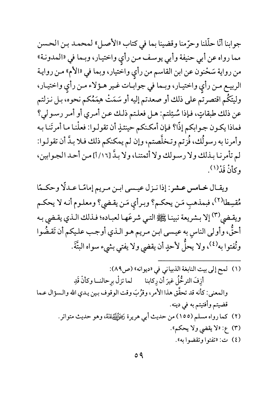 ويقال خامس عشر: إذا نزل عيسى ابن مريم إمامًا عدلًا وحكمًا مُقسِطا (¬٢)، فبمذهبِ مَن يحكم؟ وبرأيِ مَن يقضي؟ ومعلوم أنه لا يحكم ويقضي (¬٣) إلا بشريعة نبينا - صلى الله عليه وسلم - التي شرعَها لعباده؛ فذلك الذي يقضي به أحقُّ، وأولى الناسِ به عيسى ابن مريم هو الذي أوجب عليكم أن تَقضُوا وتُفتوا به (¬٤)، ولا يحلُّ لأحدٍ أن يقضي ولا يفتي بشيء سواه البتَّةَ.