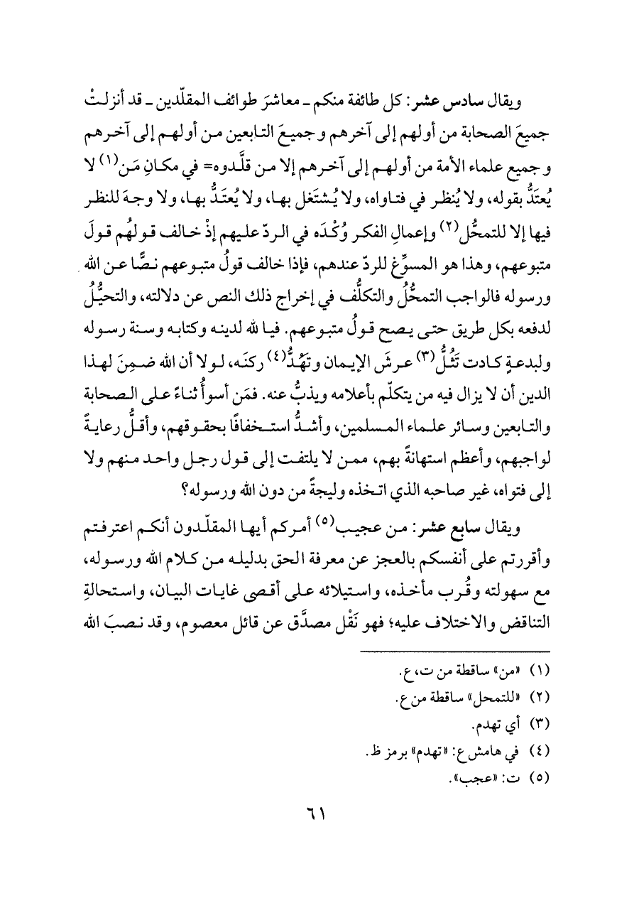 ويقال سابع عشر: من عجيب (¬٥) أمركم أيها المقلّدون أنكم اعترفتم وأقررتم على أنفسكم بالعجز عن معرفة الحق بدليله من كلام الله ورسوله، مع سهولته وقُرب مأخذه، واستيلائه على أقصى غايات البيان، واستحالةِ التناقض والاختلاف عليه؛ فهو نَقْل مصدَّق عن قائل معصوم، وقد نصبَ الله