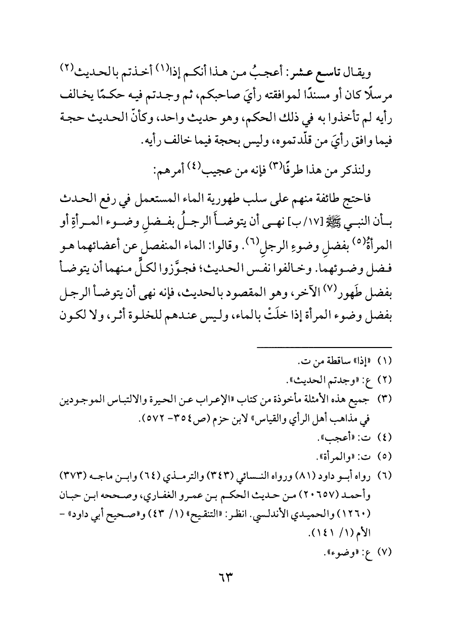 (¬٣) جميع هذه الأمثلة مأخوذة من كتاب «الإعراب عن الحيرة والالتباس الموجودين في مذاهب أهل الرأي والقياس» لابن حزم (ص ٣٥٤ - ٥٧٢).