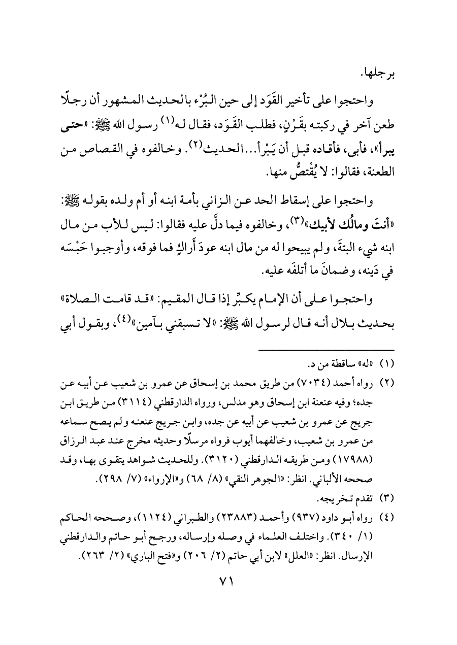 (¬٢) رواه أحمد (٧٠٣٤) من طريق محمد بن إسحاق عن عمرو بن شعيب عن أبيه عن جده؛ وفيه عنعنة ابن إسحاق وهو مدلس، ورواه الدارقطني (٣١١٤) من طريق ابن جريج عن عمرو بن شعيب عن أبيه عن جده، وابن جريج عنعنه ولم يصح سماعه من عمرو بن شعيب، وخالفهما أيوب فرواه مرسلًا وحديثه مخرج عند عبد الرزاق (١٧٩٨٨) ومن طريقه الدارقطني (٣١٢٠). وللحديث شواهد يتقوى بها، وقد صححه الألباني. انظر: «الجوهر النقي» (٨/ ٦٨) و «الإرواء» (٧/ ٢٩٨).