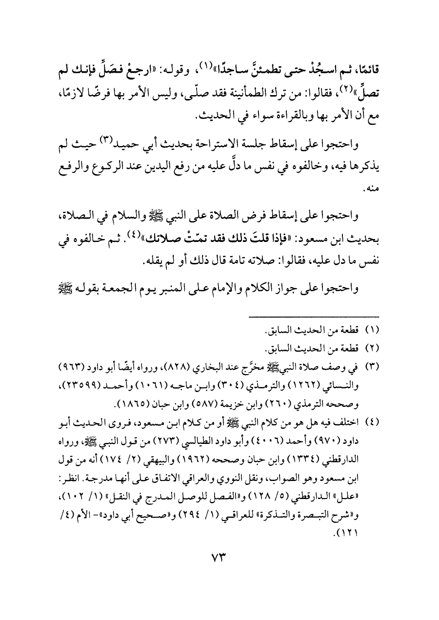 واحتجوا على إسقاط جلسة الاستراحة بحديث أبي حميد (¬٣) حيث لم يذكرها فيه، وخالفوه في نفس ما دلَّ عليه من رفع اليدين عند الركوع والرفع منه.
