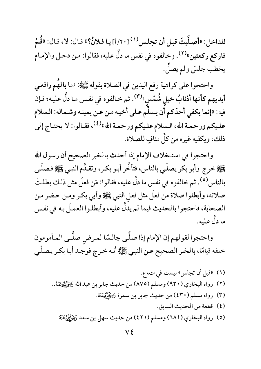 واحتجوا على كراهية رفع اليدين في الصلاة بقوله - صلى الله عليه وسلم -: «ما بالُهم رافعي أيديهم كأنها أذنابُ خيلٍ شُمْسٍ» (¬٣). ثم خالفوه في نفس ما دلَّ عليه؛ فإن فيه: «إنما يكفي أحدَكم أن يسلِّم على أخيه من عن يمينه وشماله: السلام عليكم ورحمة الله، السلام عليكم ورحمة الله» (¬٤)، فقالوا: لا يحتاج إلى ذلك، ويكفيه غيره من كلِّ منافٍ للصلاة.