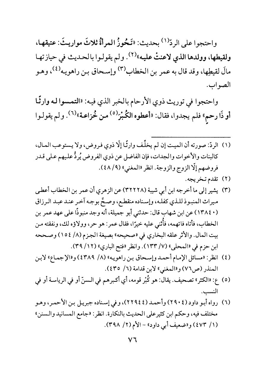 واحتجوا على الردّ (¬١) بحديث: «تَحُوزُ المرأةُ ثلاثَ مواريثَ: عتيقها، ولقيطها، وولدها الذي لاعنتْ عليه» (¬٢). ولم يقولوا بالحديث في حيازتها مالَ لقيطِها، وقد قال به عمر بن الخطاب (¬٣) وإسحاق بن راهويه (¬٤)، وهو الصواب.