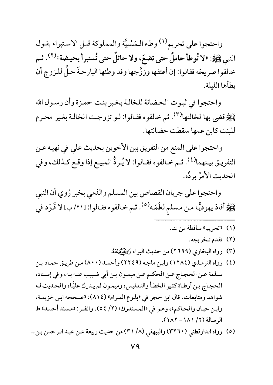 واحتجوا في ثبوت الحضانة للخالة بخبر بنت حمزة وأن رسول الله - صلى الله عليه وسلم - قضى بها لخالتها (¬٣). ثم خالفوه فقالوا: لو تزوجت الخالة بغير محرم للبنت كابن عمها سقطت حضانتها.
