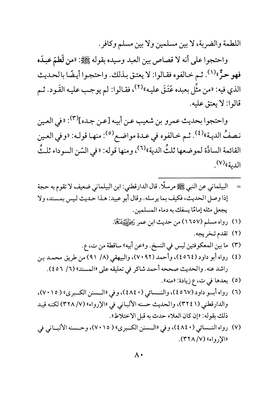 واحتجوا بحديث عمرو بن شعيب عن أبيه [عن جده] (¬٣): «في العين نصفُ الدية» (¬٤). ثم خالفوه في عدة مواضع (¬٥): منها قوله: «وفي العين القائمة السادَّة لموضعها ثلثُ الدية» (¬٦)، ومنها قوله: «في السّن السوداء ثلثُ الدية» (¬٧).