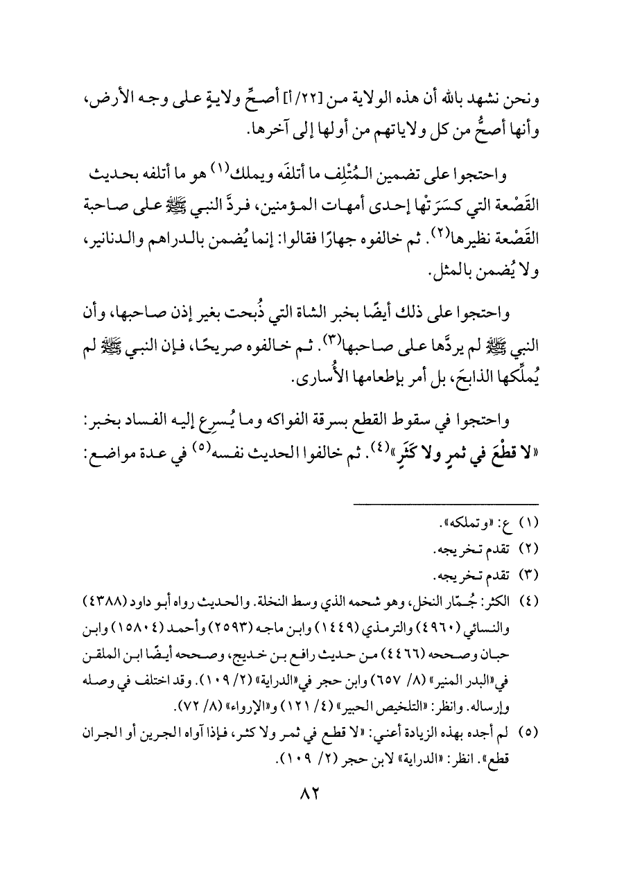 واحتجوا في سقوط القطع بسرقة الفواكه وما يُسرِع إليه الفساد بخبر: «لا قطْعَ في ثمرٍ ولا كَثَرٍ» (¬٤). ثم خالفوا الحديث نفسه (¬٥) في عدة مواضع: