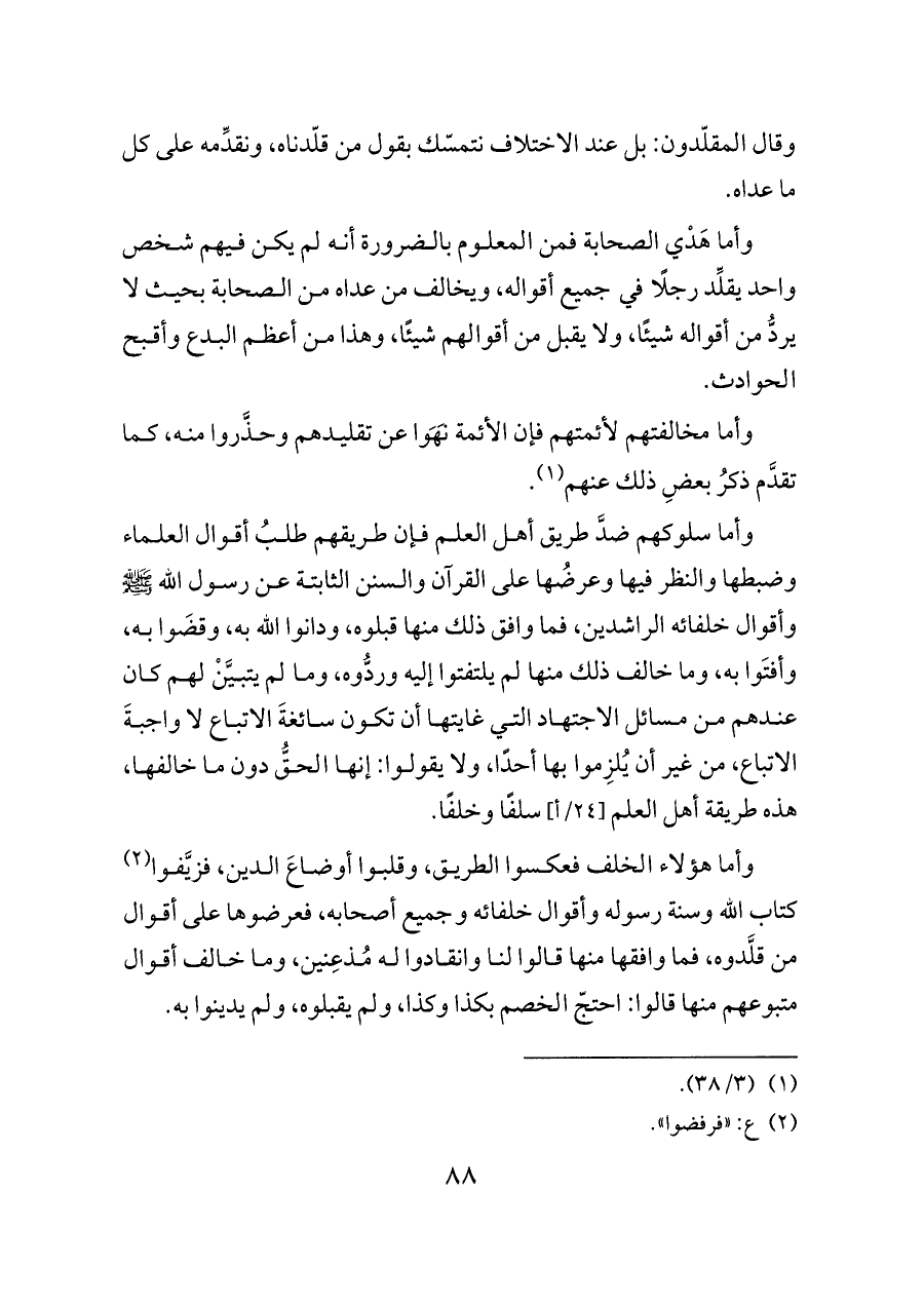 وأما سلوكهم ضدَّ طريق أهل العلم فإن طريقهم طلبُ أقوال العلماء وضبطها والنظر فيها وعرضُها على القرآن والسنن الثابتة عن رسول الله - صلى الله عليه وسلم - وأقوال خلفائه الراشدين، فما وافق ذلك منها قبلوه، ودانوا الله به، وقضَوا به، وأفتَوا به، وما خالف ذلك منها لم يلتفتوا إليه وردُّوه، وما لم يتبيَّنْ لهم كان عندهم من مسائل الاجتهاد التي غايتها أن تكون سائغةَ الاتباع لا واجبةَ الاتباع، من غير أن يُلزِموا بها أحدًا، ولا يقولوا: إنها الحقُّ دون ما خالفها، هذه طريقة أهل العلم [٢٤/أ] سلفًا وخلفًا.