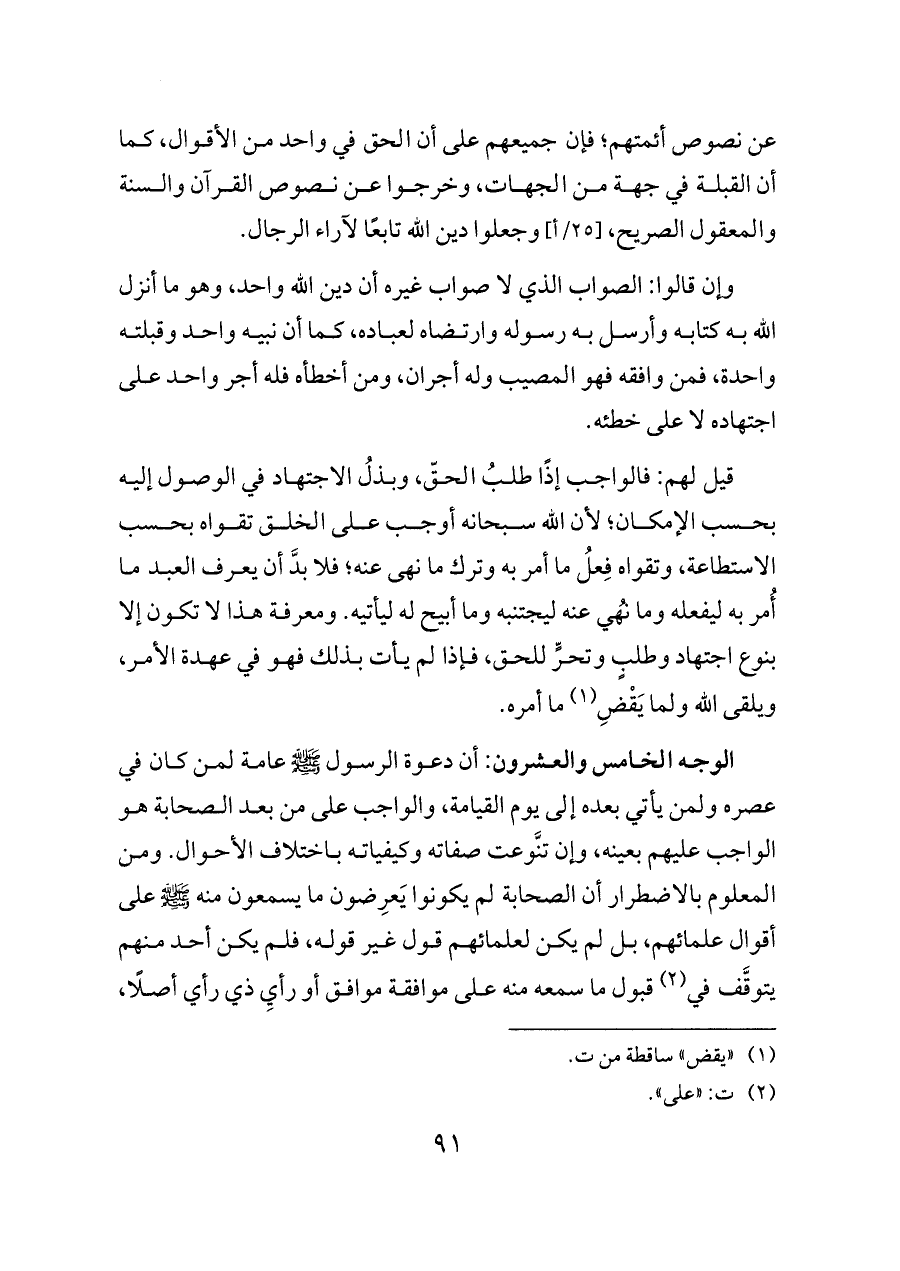 قيل لهم: فالواجب إذًا طلبُ الحقّ، وبذلُ الاجتهاد في الوصول إليه بحسب الإمكان؛ لأن الله سبحانه أوجب على الخلق تقواه بحسب الاستطاعة، وتقواه فِعلُ ما أمر به وترك ما نهى عنه؛ فلا بدَّ أن يعرف العبد ما أُمر به ليفعله وما نُهي عنه ليجتنبه وما أبيح له ليأتيه. ومعرفة هذا لا تكون إلا بنوع اجتهاد وطلبٍ وتحرٍّ للحق، فإذا لم يأت بذلك فهو في عهدة الأمر، ويلقى الله ولما يَقْضِ (¬١) ما أمره.