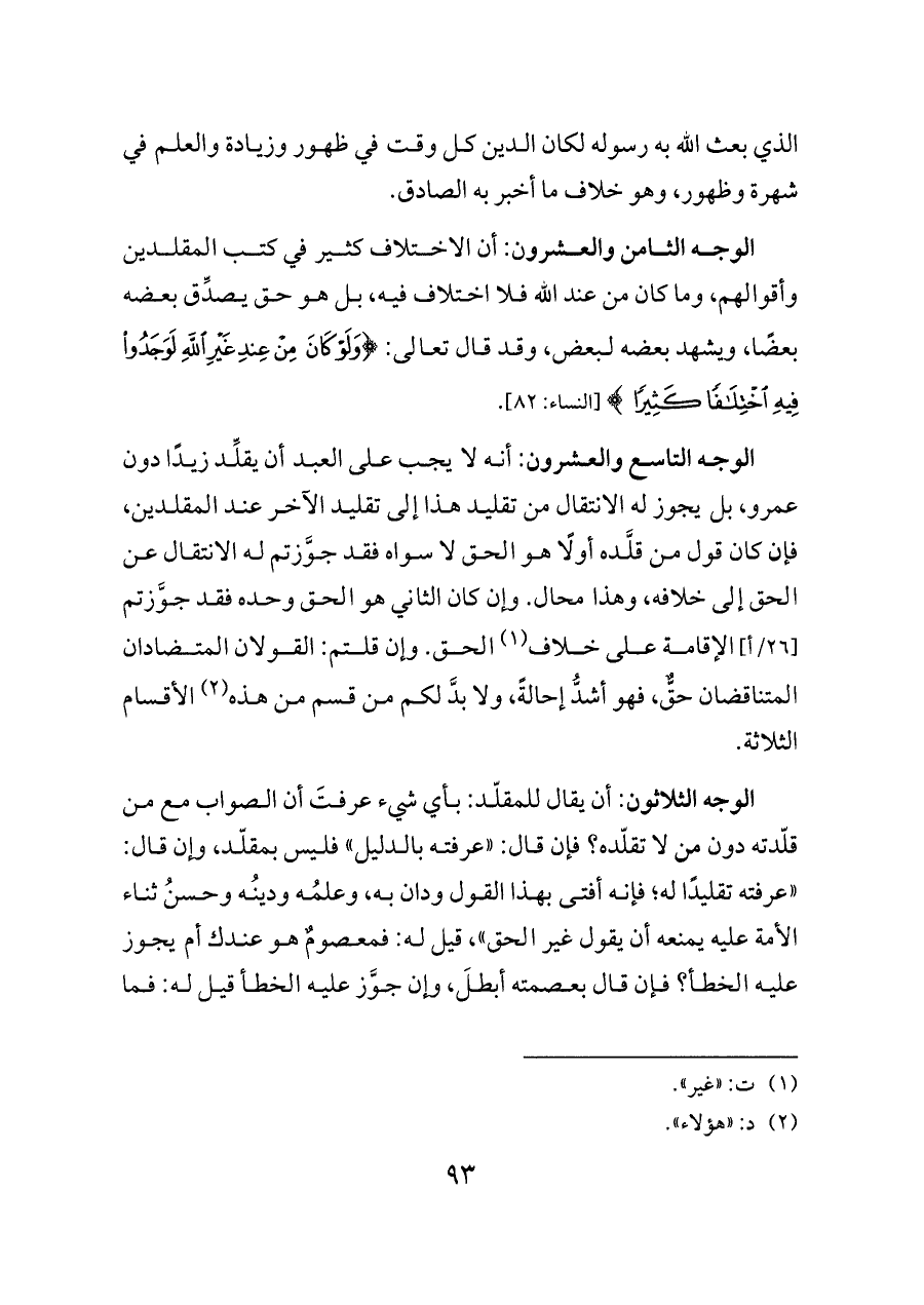 الوجه الثامن والعشرون: أن الاختلاف كثير في كتب المقلدين وأقوالهم، وما كان من عند الله فلا اختلاف فيه، بل هو حق يصدِّق بعضه بعضًا، ويشهد بعضه لبعض، وقد قال تعالى: {وَلَوْ كَانَ مِنْ عِنْدِ غَيْرِ اللَّهِ لَوَجَدُوا فِيهِ اخْتِلَافًا كَثِيرًا} [النساء: ٨٢].