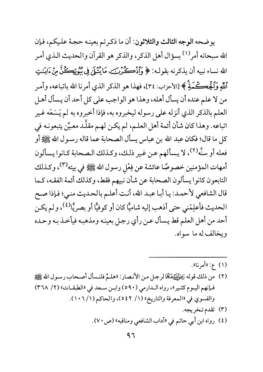 يوضحه الوجه الثالث والثلاثون: أن ما ذكرتم بعينه حجة عليكم، فإن الله سبحانه أمر (¬١) بسؤال أهل الذكر، والذكر هو القرآن والحديث الذي أمر الله نساء نبيه أن يذكرنه بقوله: {وَاذْكُرْنَ مَا يُتْلَى فِي بُيُوتِكُنَّ مِنْ آيَاتِ اللَّهِ وَالْحِكْمَةِ} [الأحزاب: ٣٤]، فهذا هو الذكر الذي أمرنا الله باتباعه، وأمر من لا علم عنده أن يسأل أهله، وهذا هو الواجب على كل أحد أن يسأل أهل العلم بالذكر الذي أنزله على رسوله ليخبروه به، فإذا أخبروه به لم يَسَعْه غير اتباعه. وهذا كان شأن أئمة أهل العلم، لم يكن لهم مقلَّد معيَّن يتبعونه في كل ما قال؛ فكان عبد الله بن عباس يسأل الصحابة عما قاله رسول الله - صلى الله عليه وسلم - أو فعله أو سنَّه (¬٢)، لا يسألهم عن غير ذلك، وكذلك الصحابة كانوا يسألون أمهات المؤمنين خصوصًا عائشة عن فِعْلِ رسول الله - صلى الله عليه وسلم - في بيته (¬٣)، وكذلك التابعون كانوا يسألون الصحابة عن شأن نبيهم فقط، وكذلك أئمة الفقه، كما قال الشافعي لأحمد: يا أبا عبد الله، أنت أعلم بالحديث مني؛ فإذا صح الحديث فأعلِمْني حتى أذهب إليه شاميًّا كان أو كوفيًّا أو بصريًّا (¬٤)،