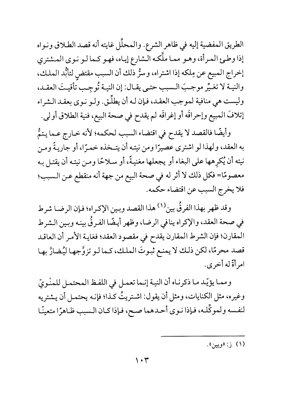 وأيضًا فالقصد لا يقدح في اقتضاء السبب لحكمه؛ لأنه خارج عما يتمُّ به العقد، ولهذا لو اشترى عصيرًا ومن نيته أن يتخذه خمرًا، أو جاريةً ومن نيته أن يُكرِهها على البغاء أو يجعلها مغنيةً، أو سلاحًا ومن نيته أن يقتل به معصومًا= فكل ذلك لا أثر له في صحة البيع من جهة أنه منقطع عن السبب؛ فلا يخرج السبب عن اقتضاء حكمه.