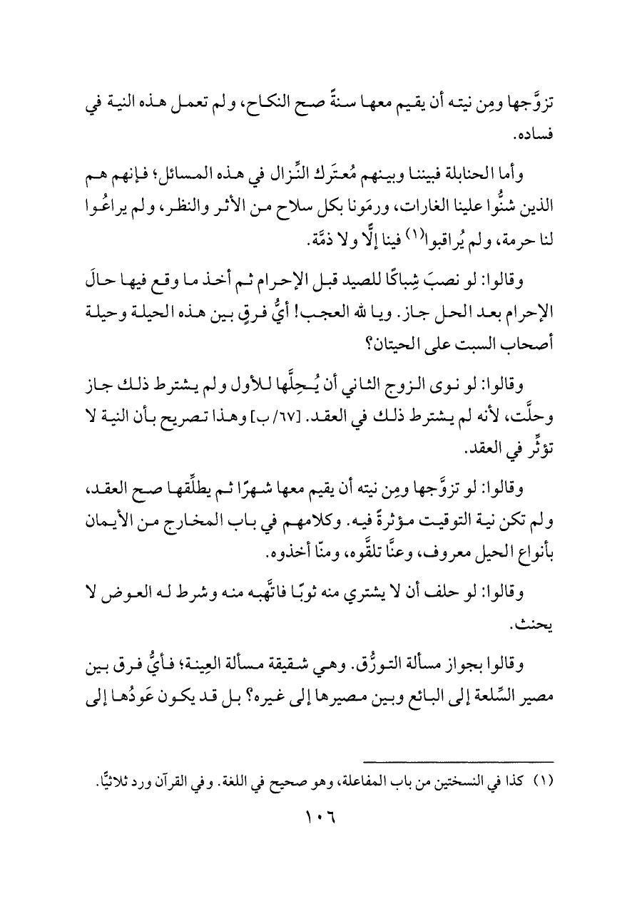 وقالوا: لو تزوَّجها ومِن نيته أن يقيم معها شهرًا ثم يطلِّقها صح العقد، ولم تكن نية التوقيت مؤثرةً فيه. وكلامهم في باب المخارج من الأيمان بأنواع الحيل معروف، وعنَّا تلقَّوه، ومنّا أخذوه.