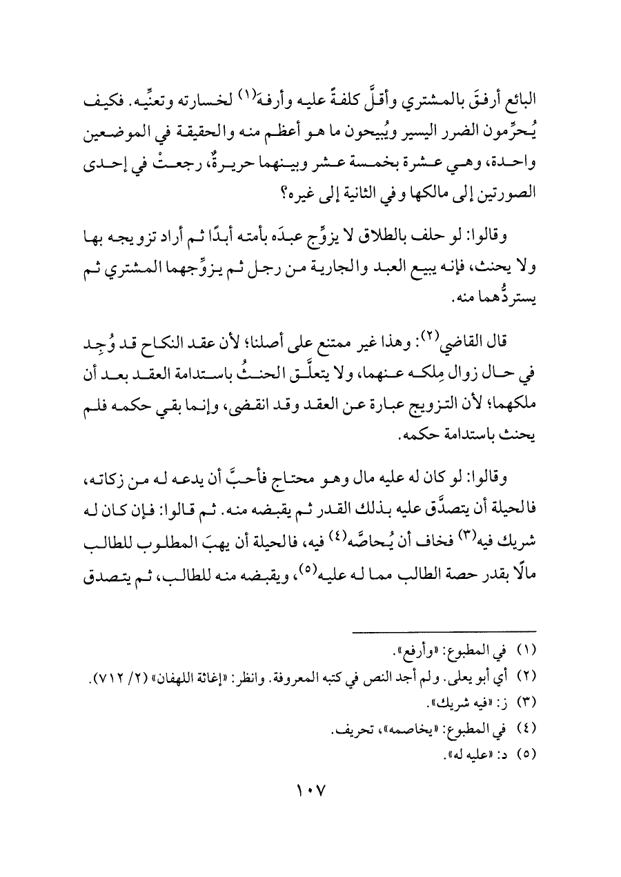 وقالوا: لو كان له عليه مال وهو محتاج فأحبَّ أن يدعه له من زكاته، فالحيلة أن يتصدَّق عليه بذلك القدر ثم يقبضه منه. ثم قالوا: فإن كان له شريك فيه (¬٣) فخاف أن يُحاصَّه (¬٤) فيه، فالحيلة أن يهبَ المطلوب للطالب مالًا بقدر حصة الطالب مما له عليه (¬٥)، ويقبضه منه للطالب، ثم يتصدق