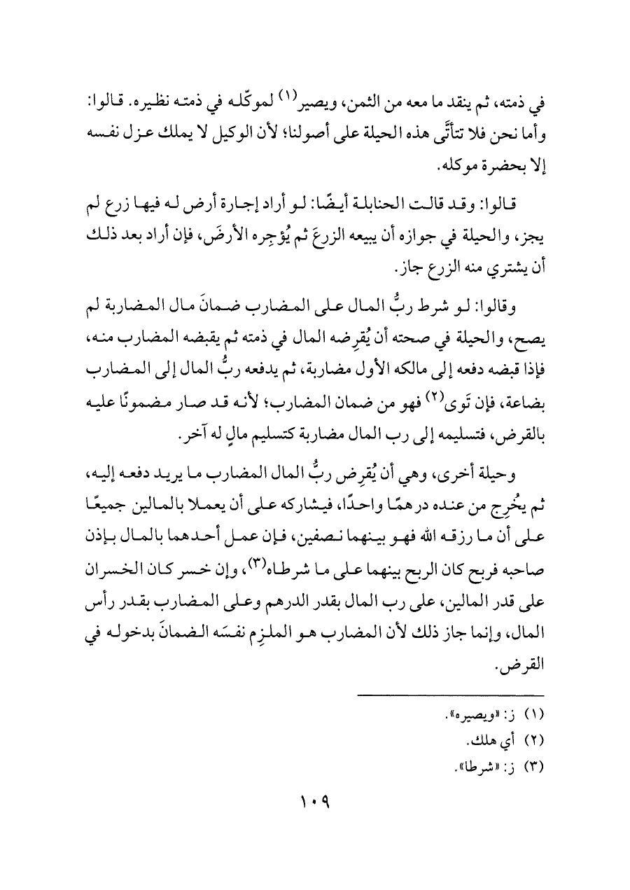 وقالوا: لو شرط ربُّ المال على المضارب ضمانَ مال المضاربة لم يصح، والحيلة في صحته أن يُقرِضه المال في ذمته ثم يقبضه المضارب منه، فإذا قبضه دفعه إلى مالكه الأول مضاربة، ثم يدفعه ربُّ المال إلى المضارب بضاعة، فإن تَوى (¬٢) فهو من ضمان المضارب؛ لأنه قد صار مضمونًا عليه بالقرض، فتسليمه إلى رب المال مضاربة كتسليم مالٍ له آخر.