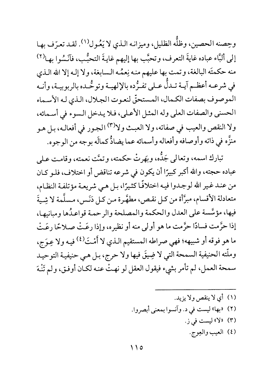 وحِصنه الحصين، وظلُّه الظليل، وميزانه الذي لا يَعُول (¬١). لقد تعرّف بها إلى ألبَّاء عباده غايةَ التعرف، وتحبَّب بها إليهم غايةَ التحبُّب، فآنَسُوا بها (¬٢) منه حكمتَه البالغة، وتمت بها عليهم منه نِعمُه السابغة، ولا إله إلا الله الذي في شرعه أعظم آية تدلُّ على تفرُّده بالإلهية وتوحُّده بالربوبية، وأنه الموصوف بصفات الكمال، المستحقّ لنعوت الجلال، الذي له الأسماء الحسنى والصفات العلى وله المثل الأعلى، فلا يدخل السوء في أسمائه، ولا النقص والعيب في صفاته، ولا العبث ولا (¬٣) الجور في أفعاله، بل هو منزَّه في ذاته وأوصافه وأفعاله وأسمائه عما يضادُّ كمالَه بوجه من الوجوه.