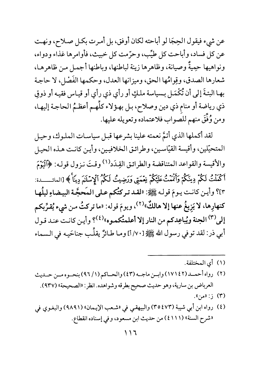 لقد أكملها الذي أتمَّ نعمته علينا بشرعها قبل سياسات الملوك، وحيل المتحيّلين، وأقيسة القياسيين، وطرائق الخلافيين، وأين كانت هذه الحيل والأقيسة والقواعد المتناقضة والطرائق القِدَد (¬١) وقتَ نزول قوله: {الْيَوْمَ أَكْمَلْتُ لَكُمْ دِينَكُمْ وَأَتْمَمْتُ عَلَيْكُمْ نِعْمَتِي وَرَضِيتُ لَكُمُ الْإِسْلَامَ دِينًا} [المائدة: ٣]؟ وأين كانت يومَ قوله - صلى الله عليه وسلم -: «لقد تركتُكم على المَحجَّة البيضاءِ ليلُها كنهارِها، لا يَزِيغُ عنها إلا هالكٌ» (¬٢)، ويومَ قوله: «ما تركتُ من شيء يُقرِّبكم إلى (¬٣) الجنة ويُباعِدكم من النار إلا أعلمتُكموه» (¬٤)؟ وأين كانت عند قول أبي ذر: لقد توفي رسول الله - صلى الله عليه وسلم -[٧٠/أ] وما طائرٌ يقلِّب جناحَيه في السماء