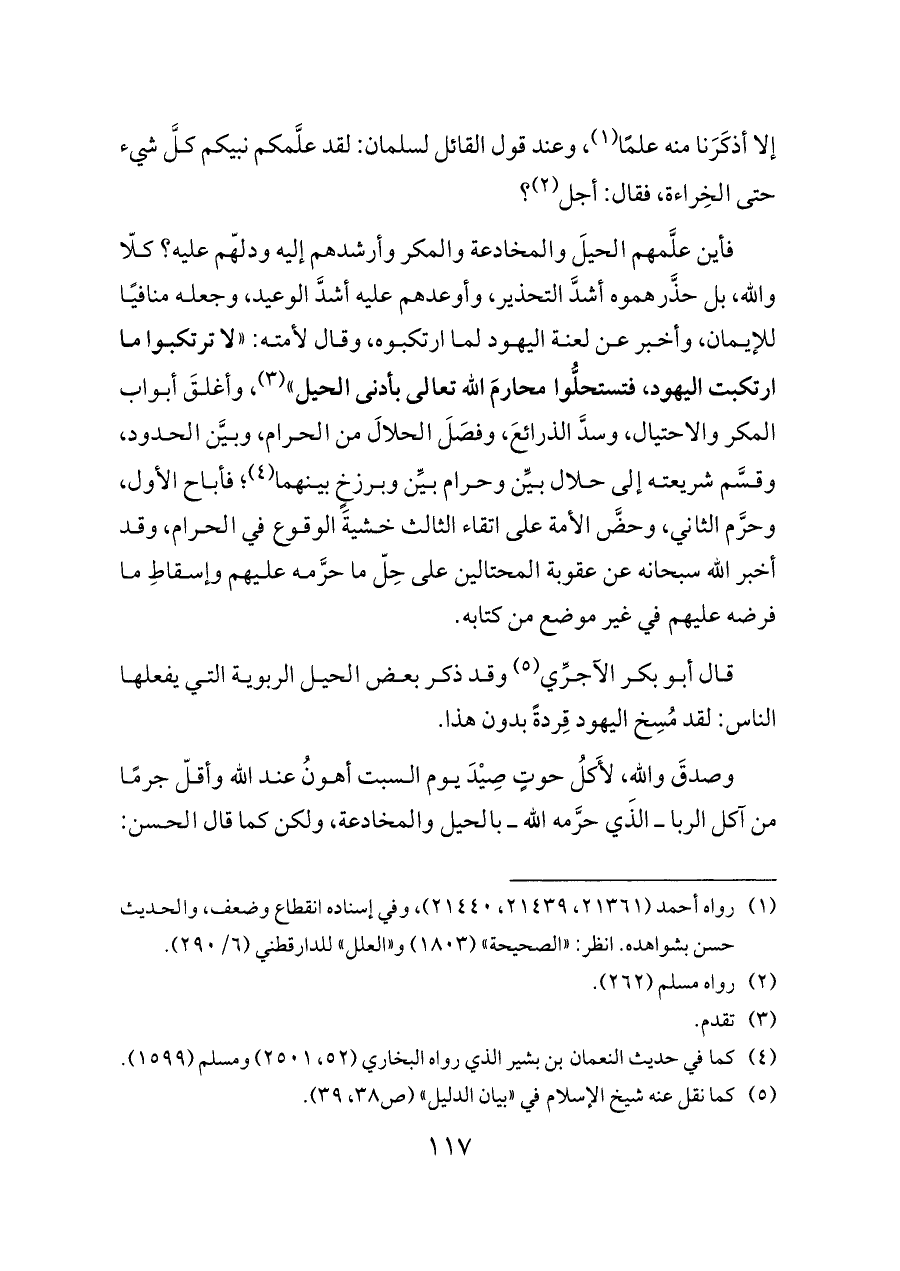 وصدقَ واللهِ، لأَكلُ حوتٍ صِيْدَ يوم السبت أهونُ عند الله وأقلّ جرمًا من آكل الربا ــ الذي حرَّمه الله ــ بالحيل والمخادعة، ولكن كما قال الحسن: