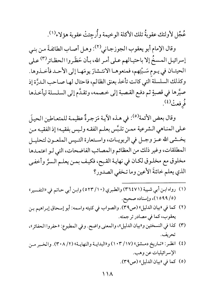 وقال الإمام أبو يعقوب الجوزجاني (¬٢): وهل أصاب الطائفةَ من بني إسرائيل المسخُ إلا باحتيالهم على أمر الله، بأن حَظَروا الحظائر (¬٣) على الحيتان في يومِ سَبْتِهم، فمنعوها الانتشارَ يومَها إلى الأحد فأخذوها. وكذلك السلسلة التي كانت تأخذ بعنق الظالم، فاحتال لها صاحب الدرَّة إذ صيَّرها في قصبةٍ ثم دفع القصبة إلى خصمه، وتقدَّم إلى السلسلة ليأخذها فُرِفعتْ (¬٤).